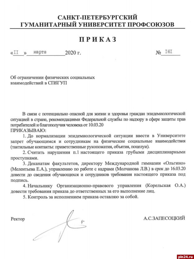Как следует из приказа, в связи с потенциально опасной для жизни и здоровья граждан эпидемиологической ситуацией в стране в университете устанавливается запрет для обучающихся и сотрудников «на физические социальные взаимодействия (приветственные рукопожатия, объятия, поцелуи)».