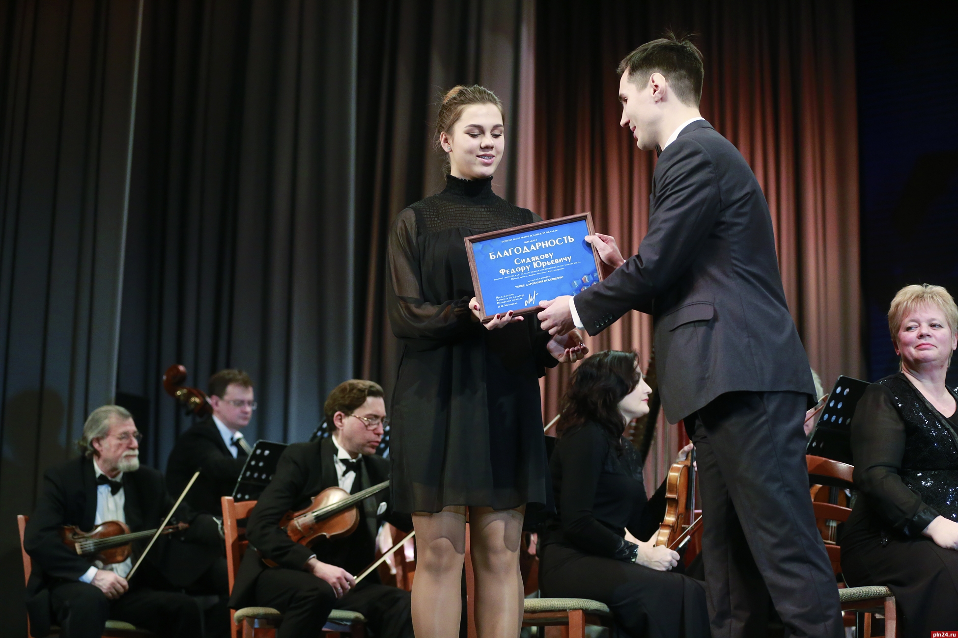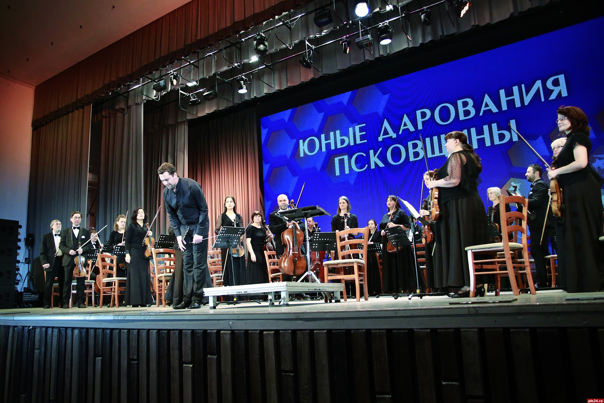 Концерт «Юные дарования Псковщины» прошел в субботу, 23 ноября, в Пскове в большом концертном зале Псковской областной филармонии. На одной сцене вместе выступили юные талантливые музыканты Псковской области и региональный симфонический оркестр под управлением главного дирижера Николая Хондзинского.
