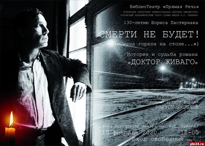 10 февраля, в день рождения Бориса Пастернака, Псковский академический театр драмы им. А.С. Пушкина и Псковская областная универсальная научная библиотека приглашают на моноспектакль «Смерти не будет!» («Свеча горела…»).