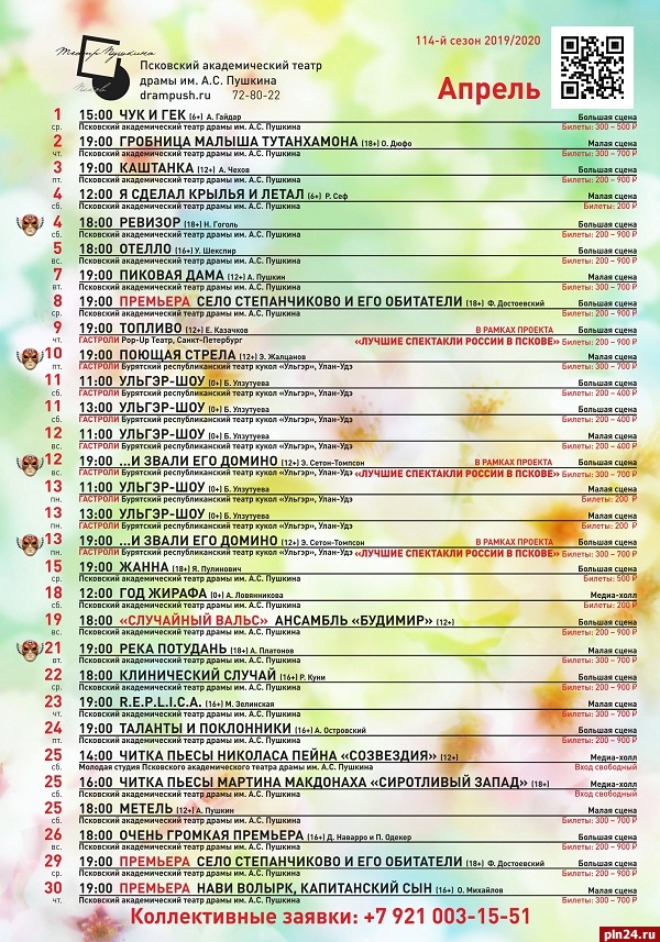 Псковский академический театр драмы им. А. С. Пушкина напоминает своим зрителям, что билеты на репертуарные спектакли апреля, идущие на Большой сцене, можно приобрести уже сейчас за половину стоимости. Как сообщили Псковской Ленте Новостей в пресс-службе ТКД, льготная акция на апрельские постановки будет действовать до конца марта и распространяется на следующие спектакли: