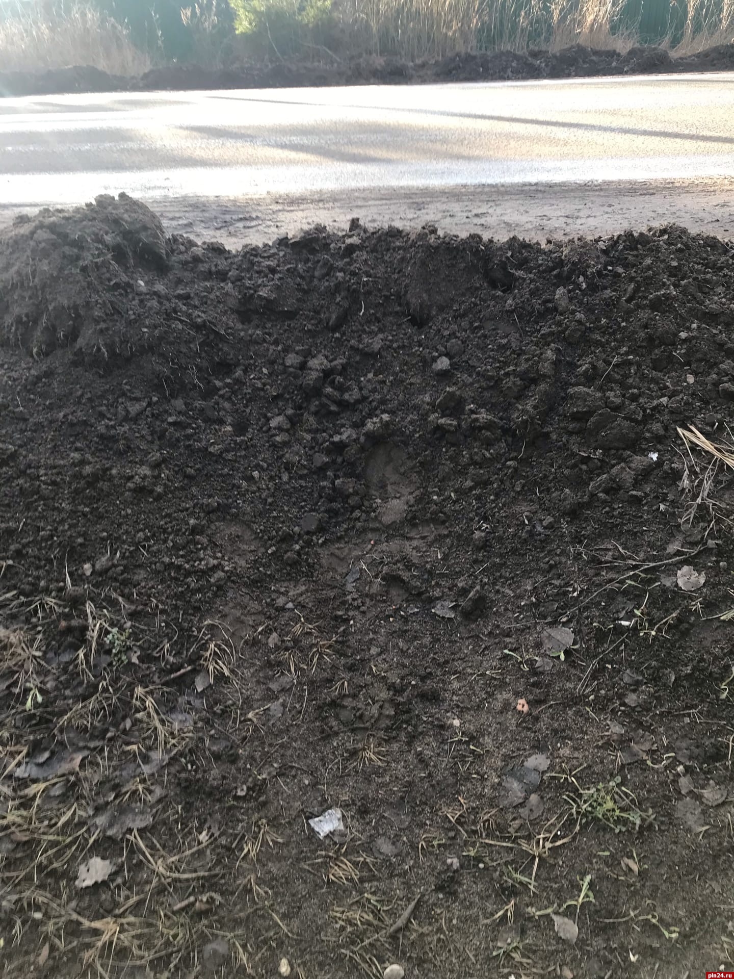 Пскович Игорь Колодцев опубликовал в группе «Инцидент Псков» в социальной сети ВКонтакте снимки, сделанные на улице Карбышева. На них видно, что на обочинах дороги образовались груды грязи.