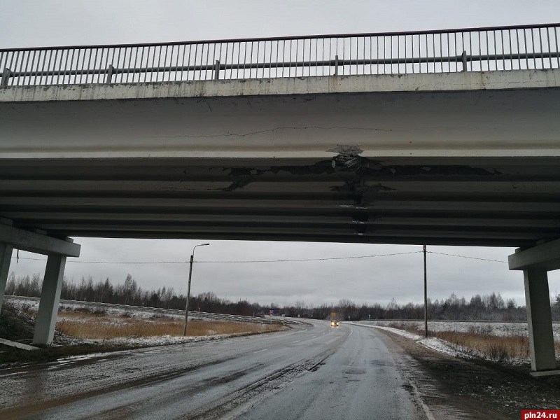«Грузовик с тралом ехал по автодороге Северный обход Пскова. Экскаватор, который был на трале, не вписался в подмостовой габарит путепровода и серьезно повредил балки пролетного строения, в связи с чем движение по путепроводу прекращено до выполнения ремонта пролетного строения», - сообщили в комитете.