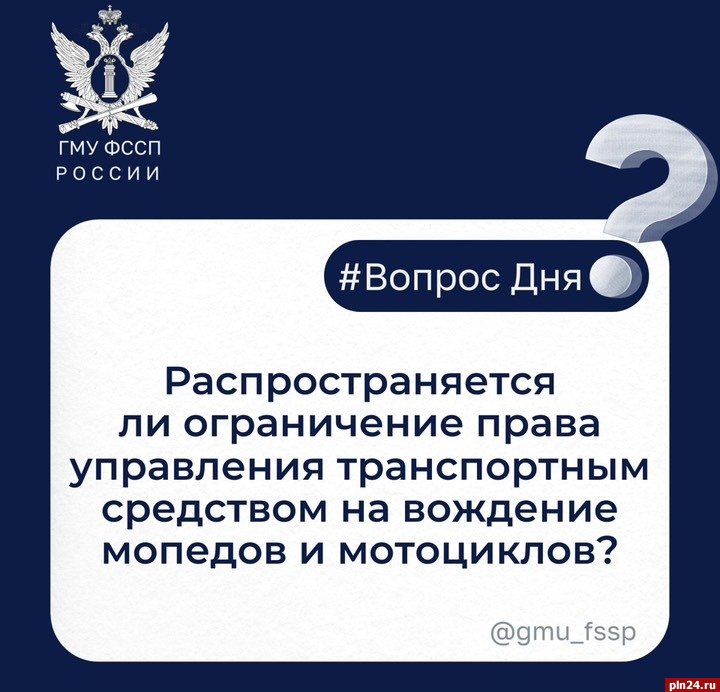 Судебные приставы подтвердили наличие ограничений права управления транспортным средством на вождение мопедов и мотоциклов. Об этом Псковской Ленте Новостей сообщили в пресс-службе ГМУ ФССП России.