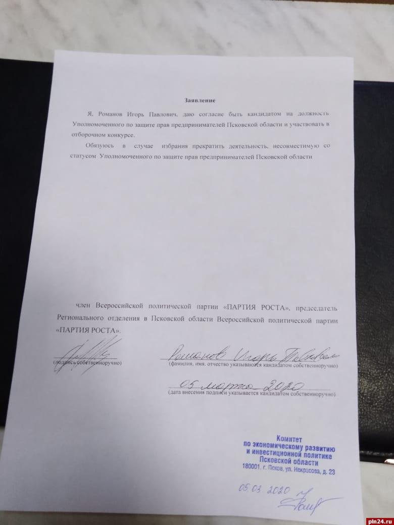 Председатель Псковского регионального отделения «Партии Роста», предприниматель Игорь Романов подал сегодня, 5 марта, заявление на участие в отборочном конкурсе по выбору кандидатов на замещение должности уполномоченного по защите прав предпринимателей в Псковской области. Об этом он сообщил Псковской Ленте Новостей.