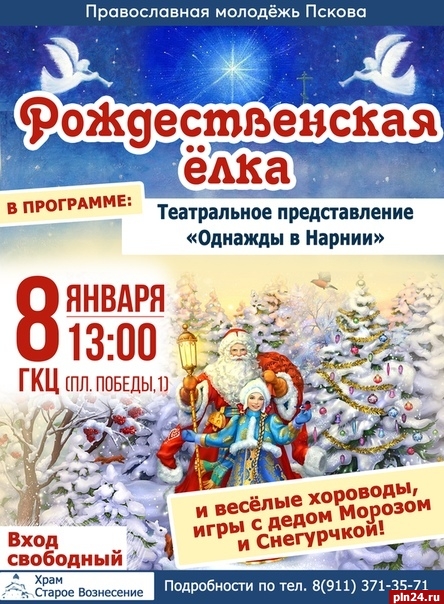 Гостей праздника ждет театральное представление «Однажды в Нарнии», подготовленное сообществом «Православная молодежь Пскова», веселые хороводы и игры с Дедом Морозом и Снегурочкой.
