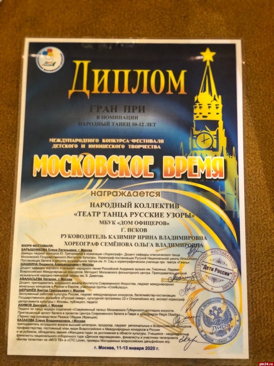 Народный коллектив «Театр танца «Русские узоры» МБУК «Дом офицеров» города Пскова успешно выступил 11-13 января на международном конкурсе-фестивале детского и юношеского творчества «Московское время» в Москве.