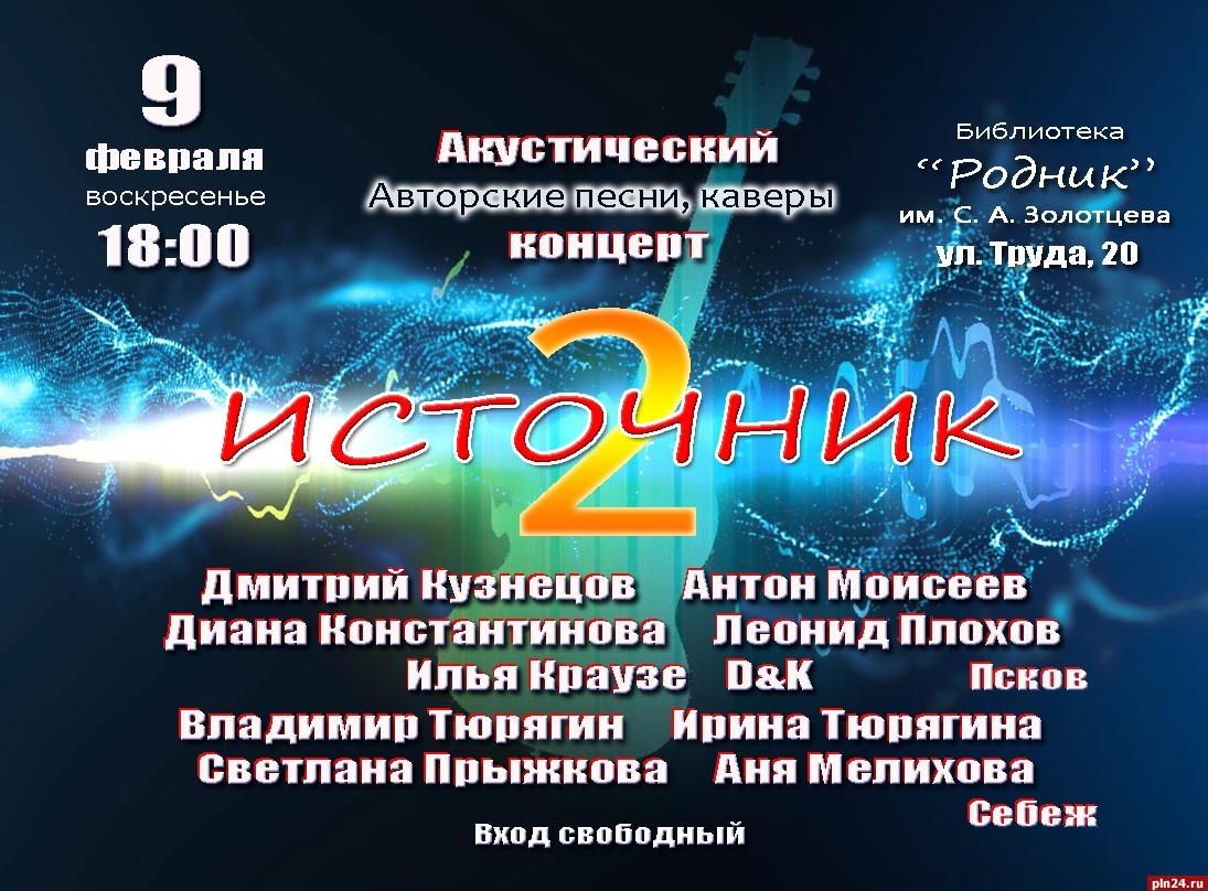 9 февраля в псковской библиотеке «Родник» им. С.А.Золотцева на Труда, 20 состоится большой акустический концерт.