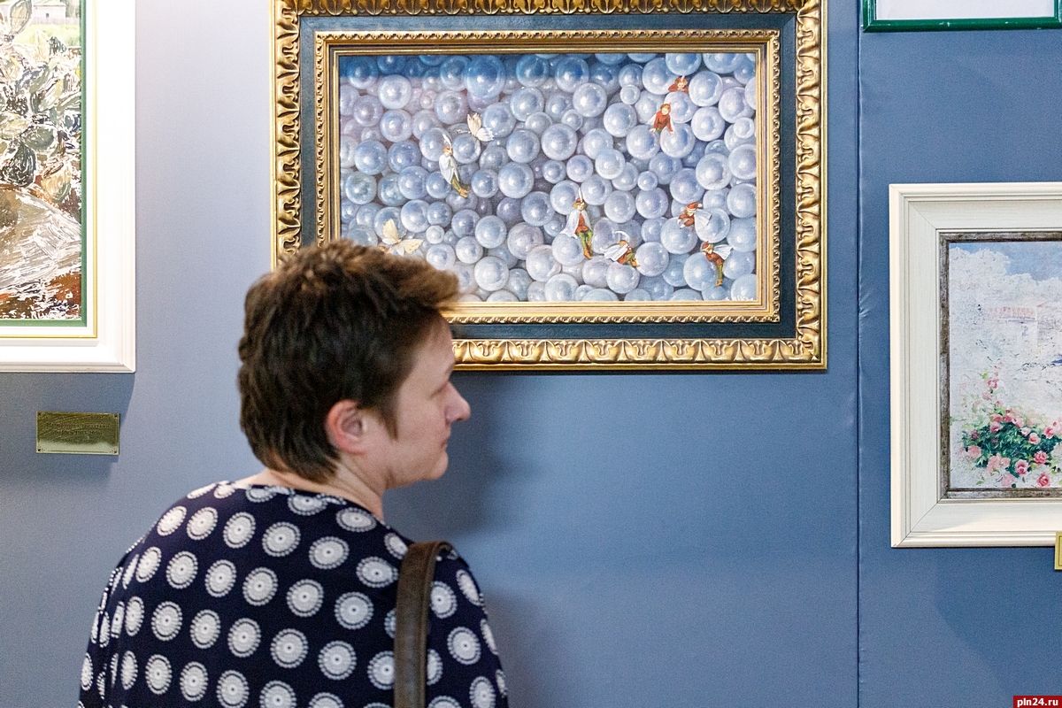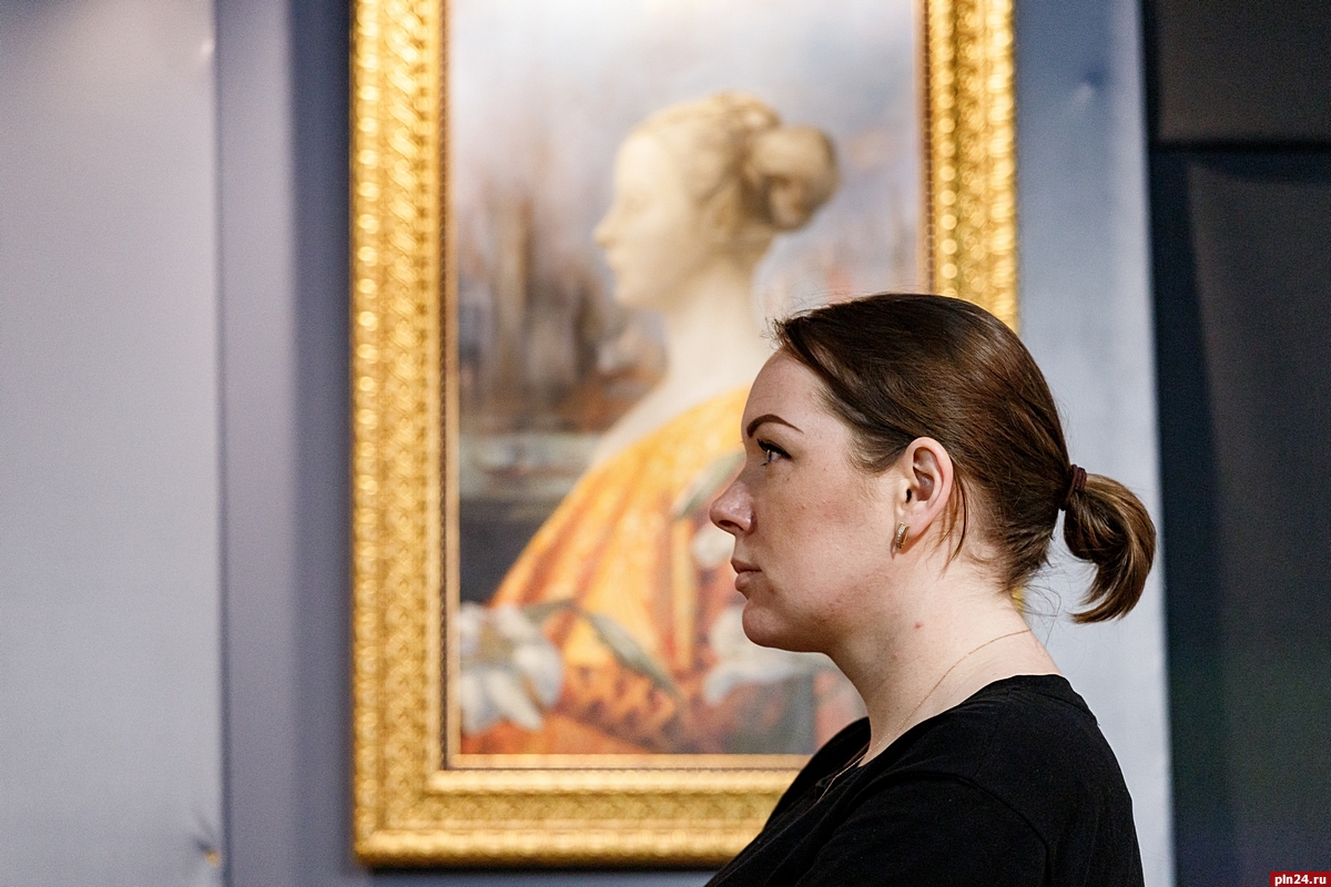 Среди полотен изображения ангелов и храмов, экзотически пейзажей и русских просторов и даже девушек с букетами цветов вместо головы. Все картины для псковской выставки художник подбирал лично. Основной акцент при этом Никас Сафронов сделал на изображения ангелов, так как считает Псков священным городом.
