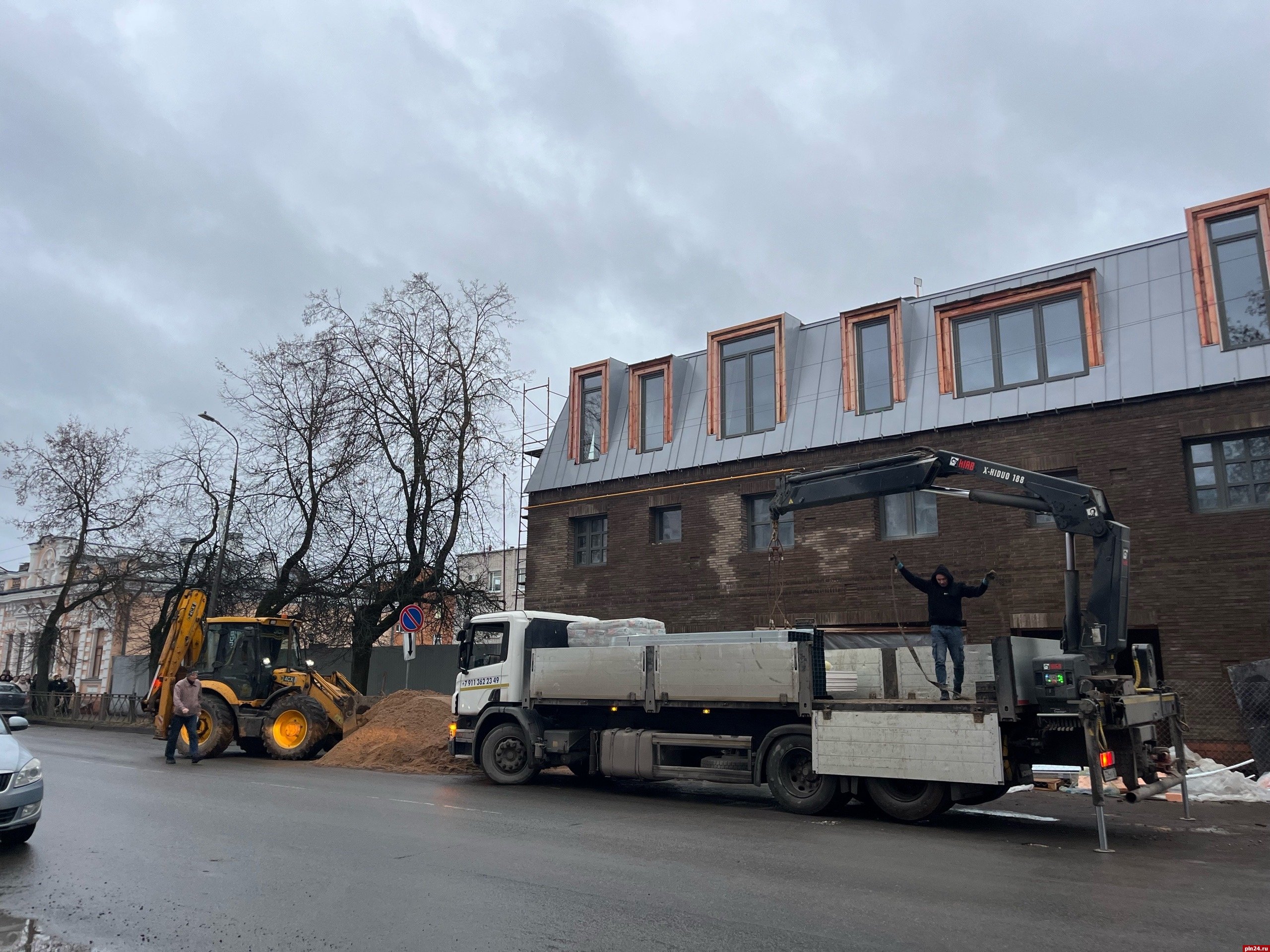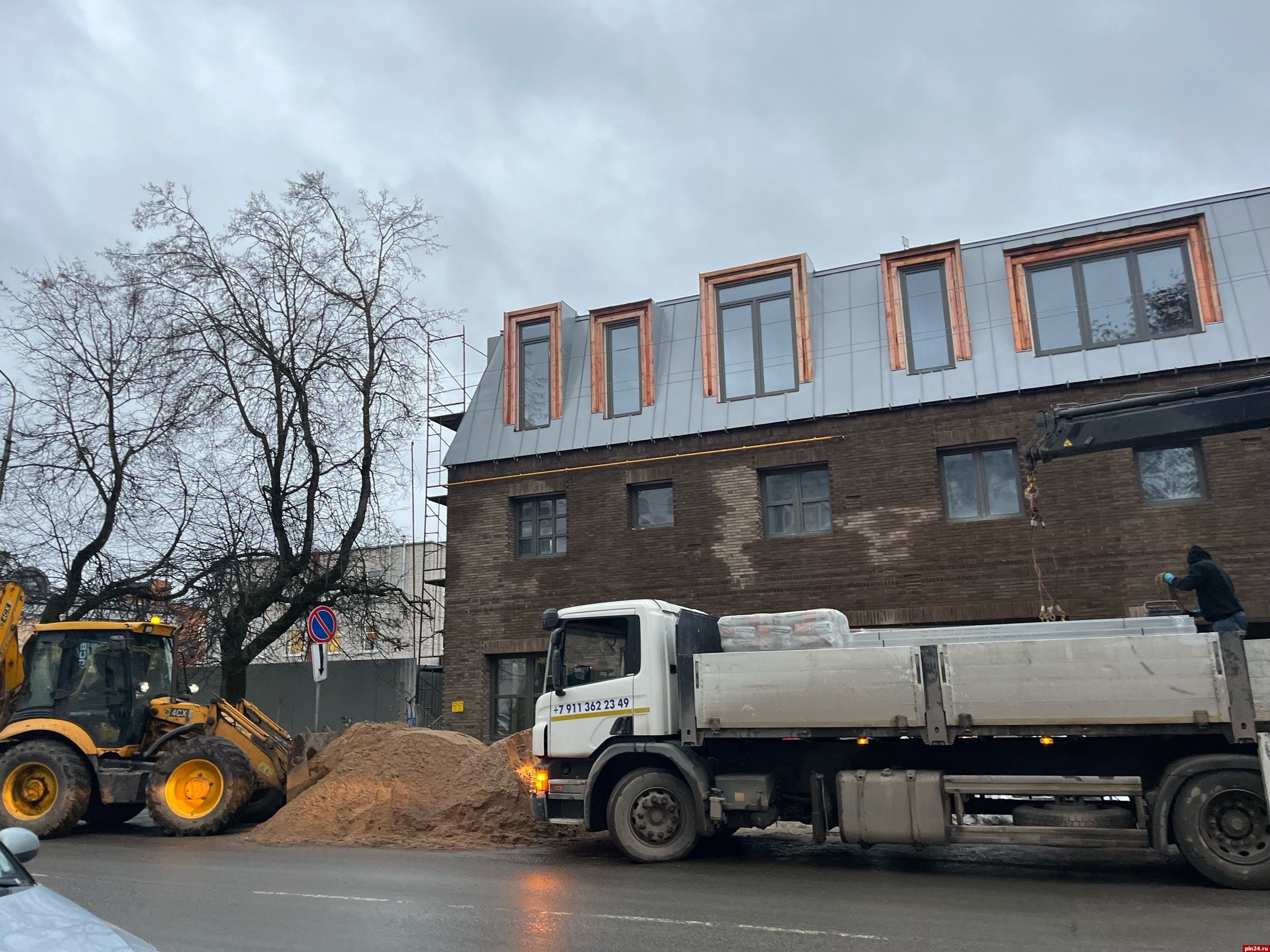 Гора песка мешают проезду на улице Советской в Пскове, напротив Первой музыкальной школы.