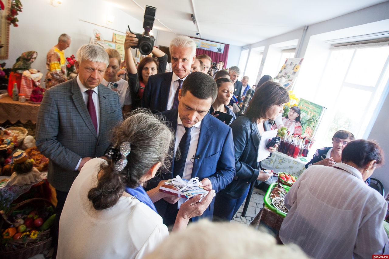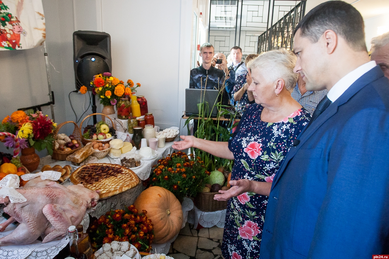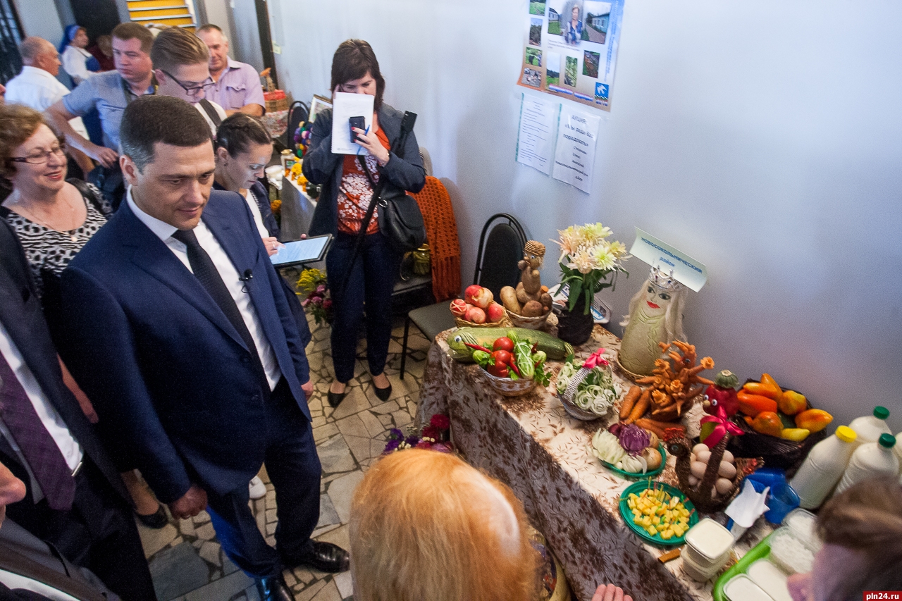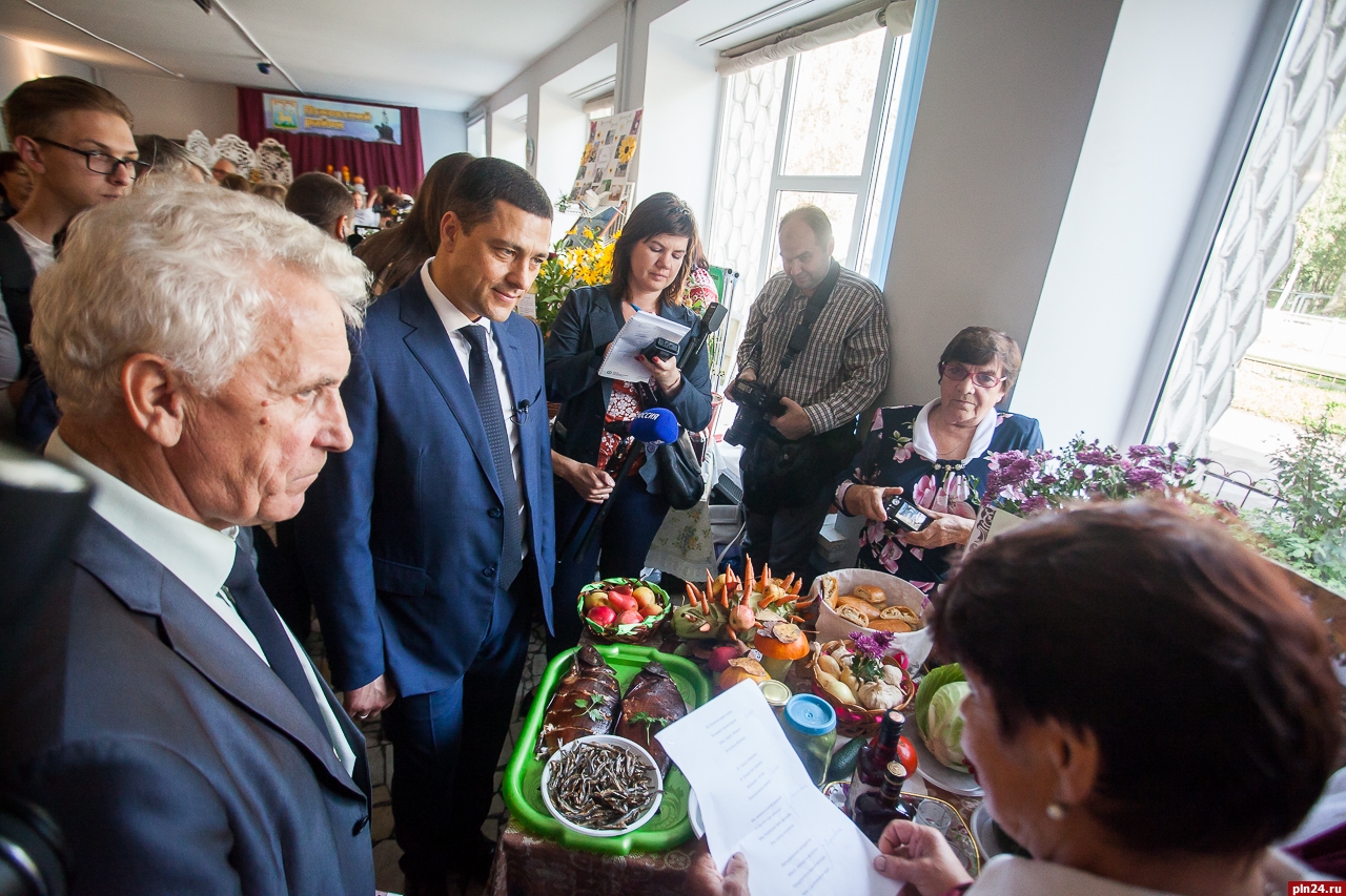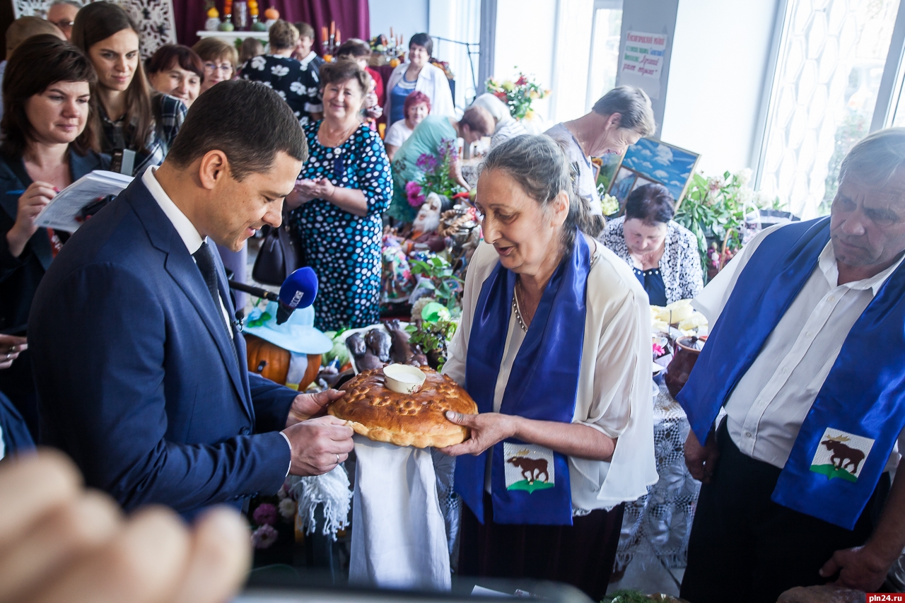 Бежаницкий район представил врио губернатора свою продукцию - копченую рыбу, сало, блинчики с творогом, свежий урожай слив. Ветераны из Бежаниц угостили врио хлебом с солью.