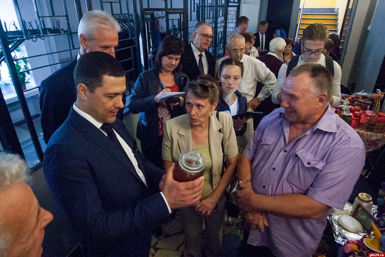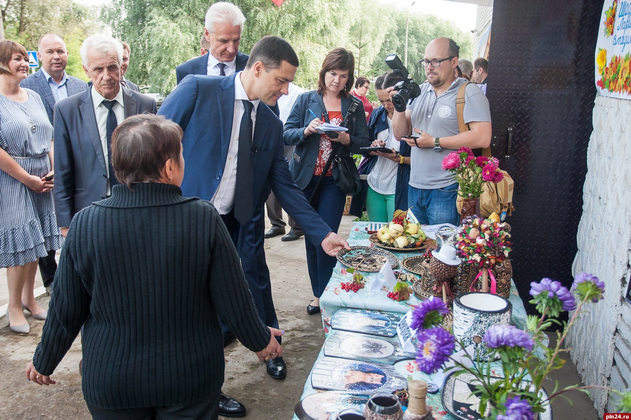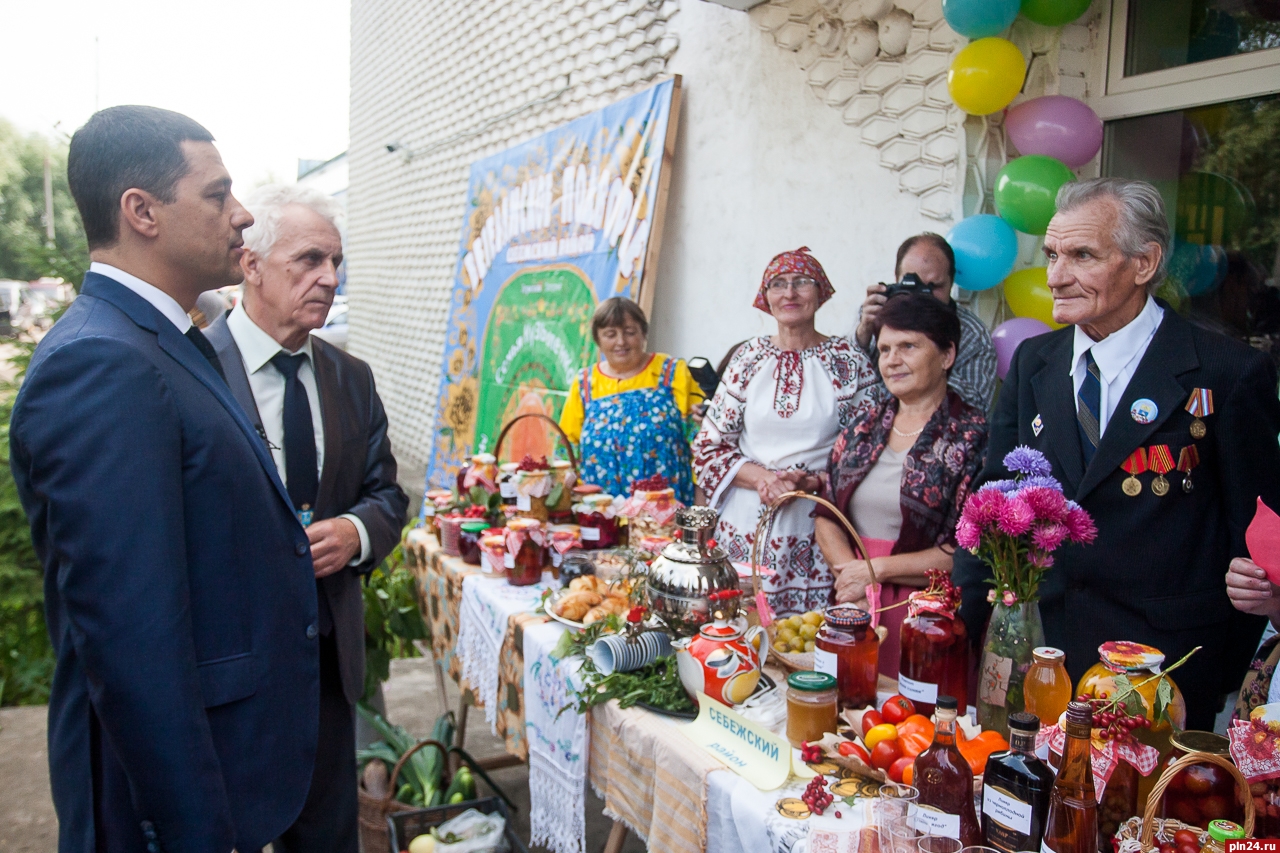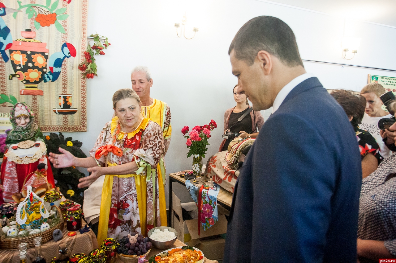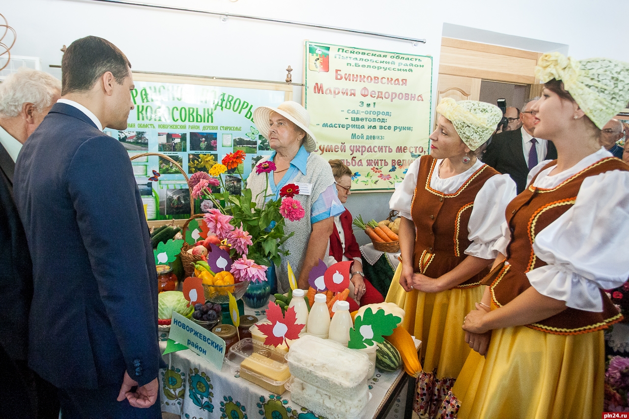 Бежаницкий район представил врио губернатора свою продукцию - копченую рыбу, сало, блинчики с творогом, свежий урожай слив. Ветераны из Бежаниц угостили врио хлебом с солью.