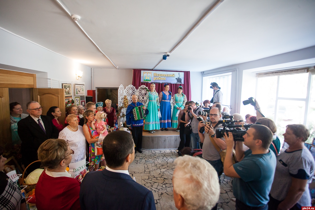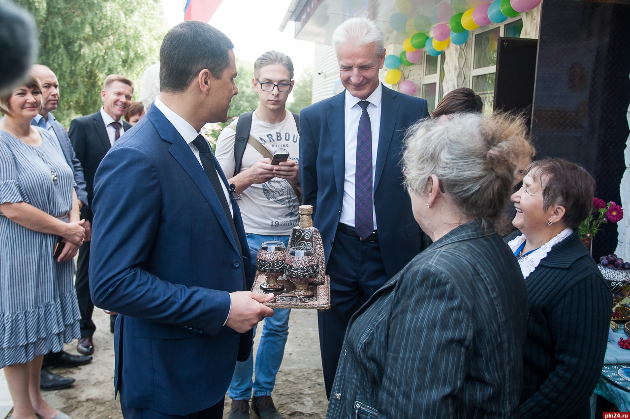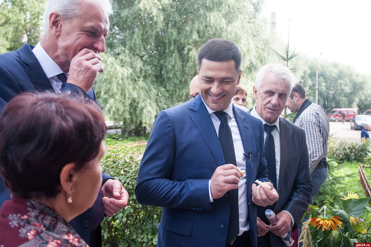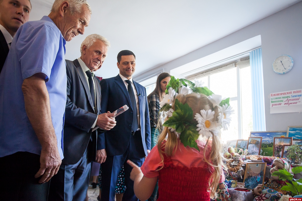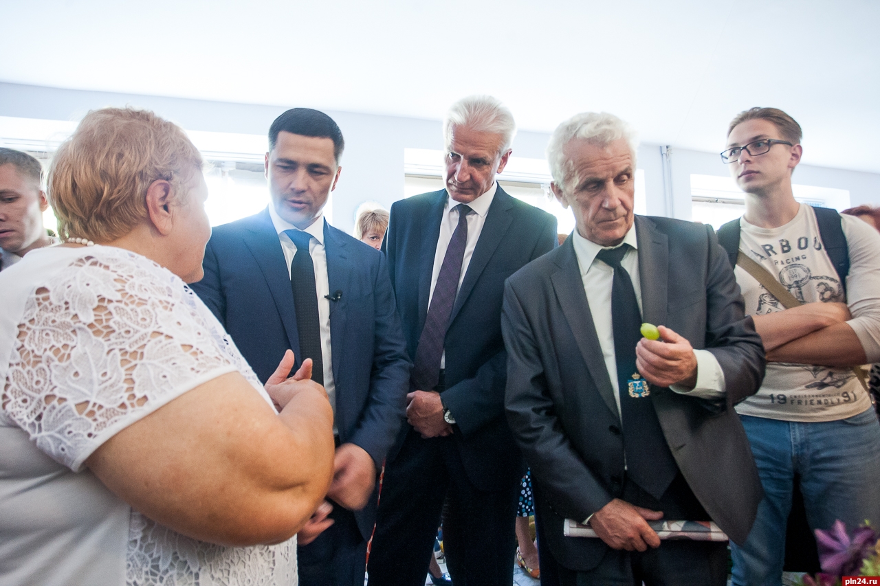 Бежаницкий район представил врио губернатора свою продукцию - копченую рыбу, сало, блинчики с творогом, свежий урожай слив. Ветераны из Бежаниц угостили врио хлебом с солью.