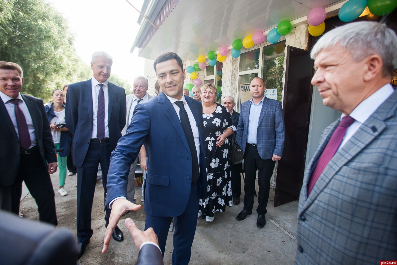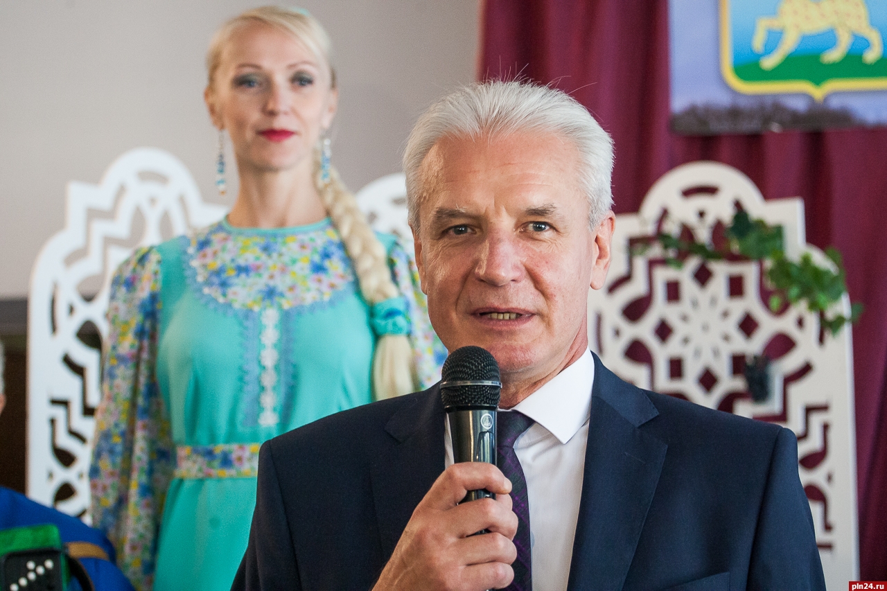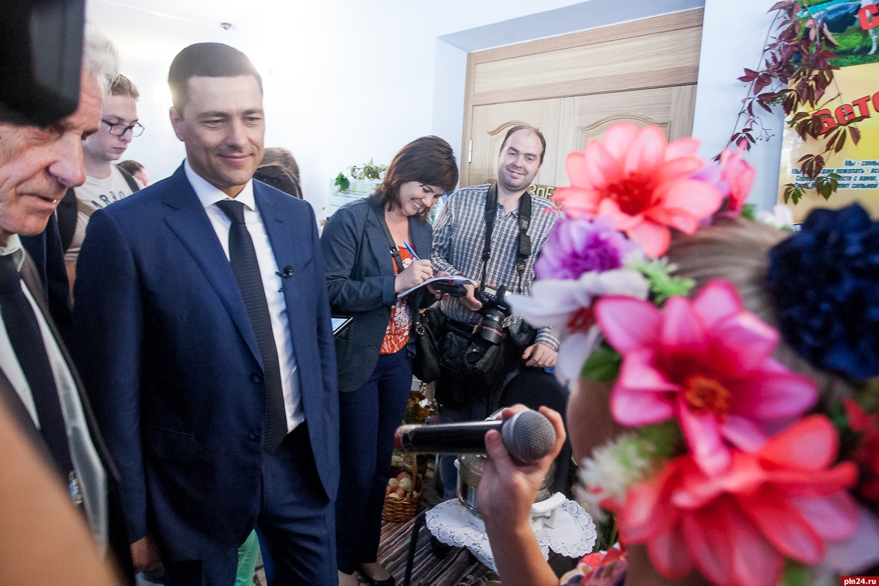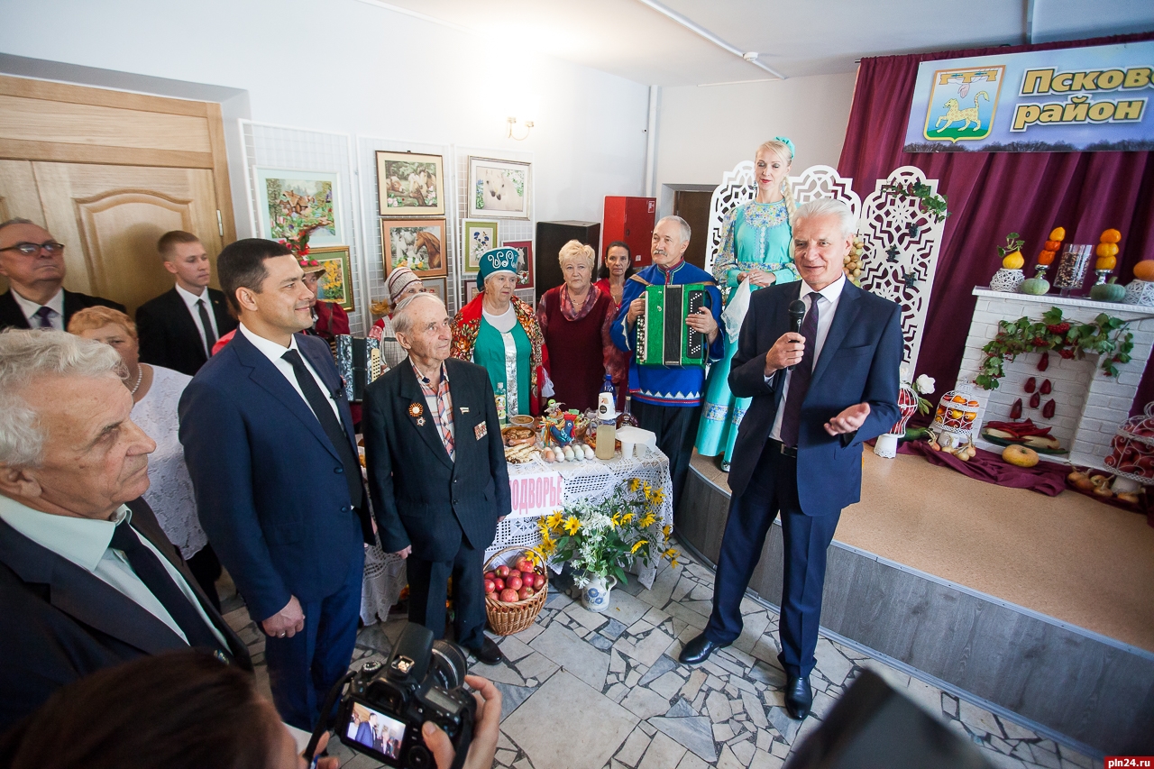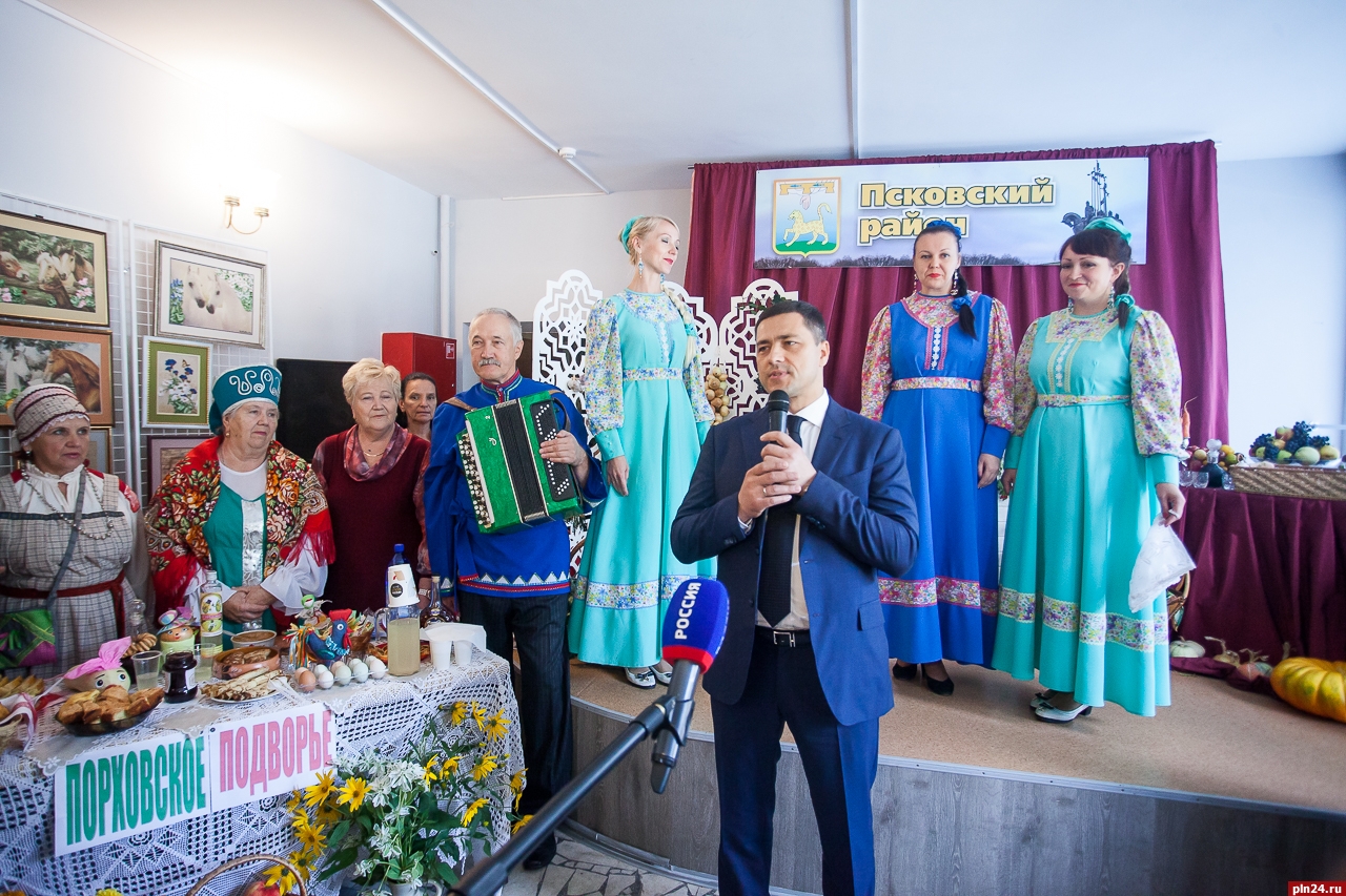 Бежаницкий район представил врио губернатора свою продукцию - копченую рыбу, сало, блинчики с творогом, свежий урожай слив. Ветераны из Бежаниц угостили врио хлебом с солью.