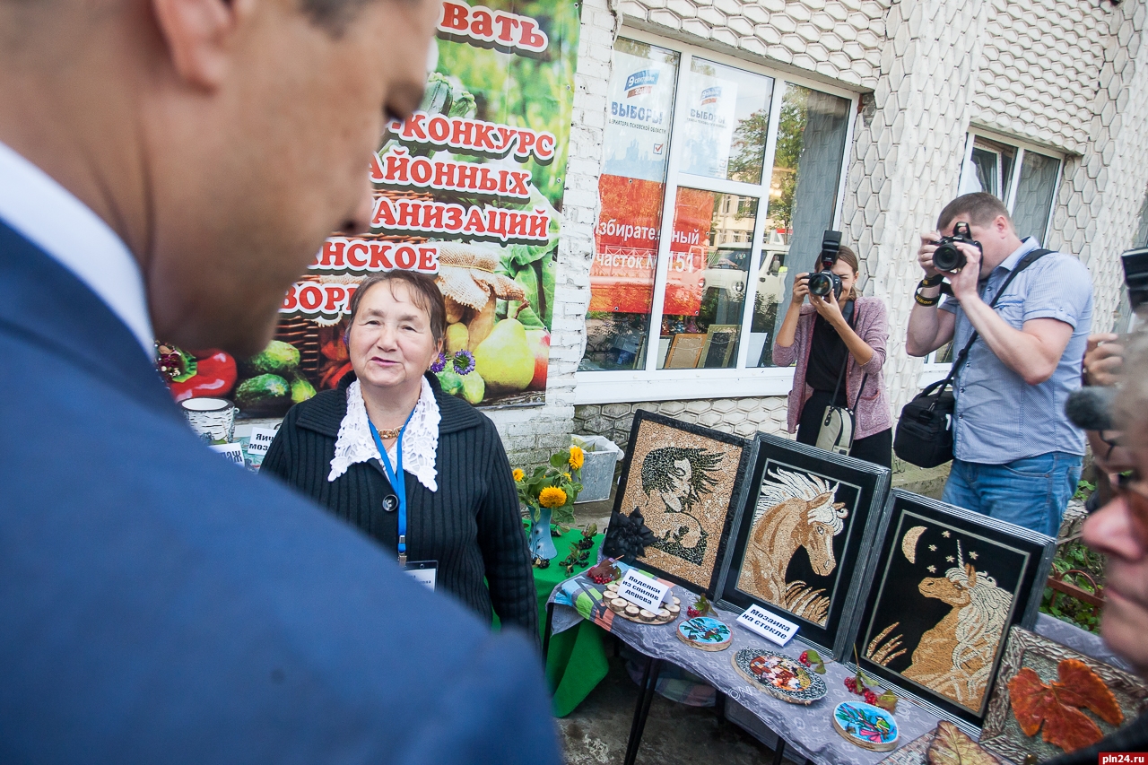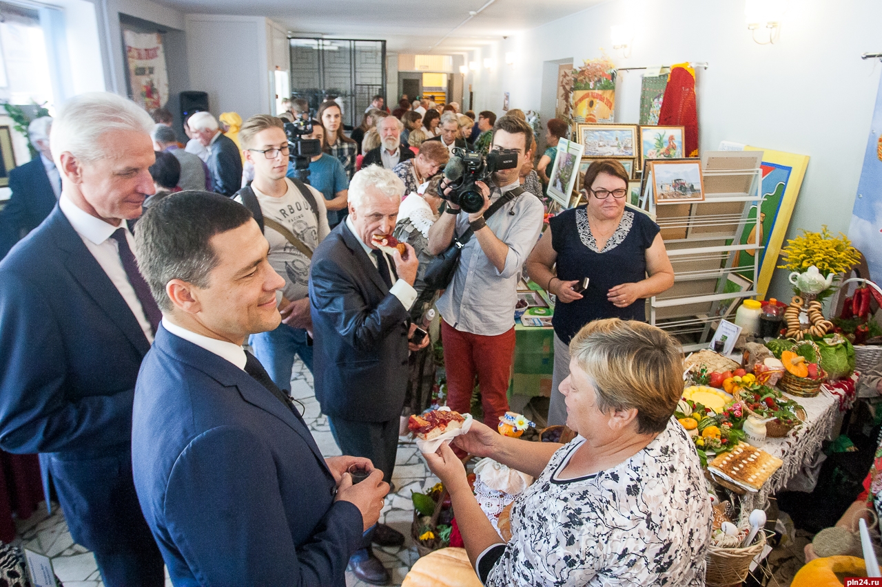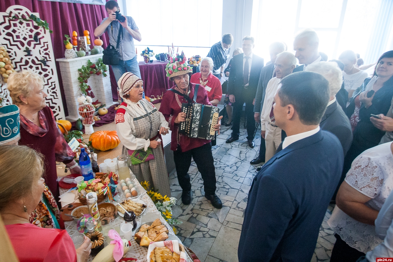 Ветераны Островского района рассказали губернатору о технологии приготовления домашнего творога и сыров. Ольга Гаврилова из Опочецкого района привезла на конкурс большой пирог, домашние йогурты и соленья, свежие фрукты и овощи.