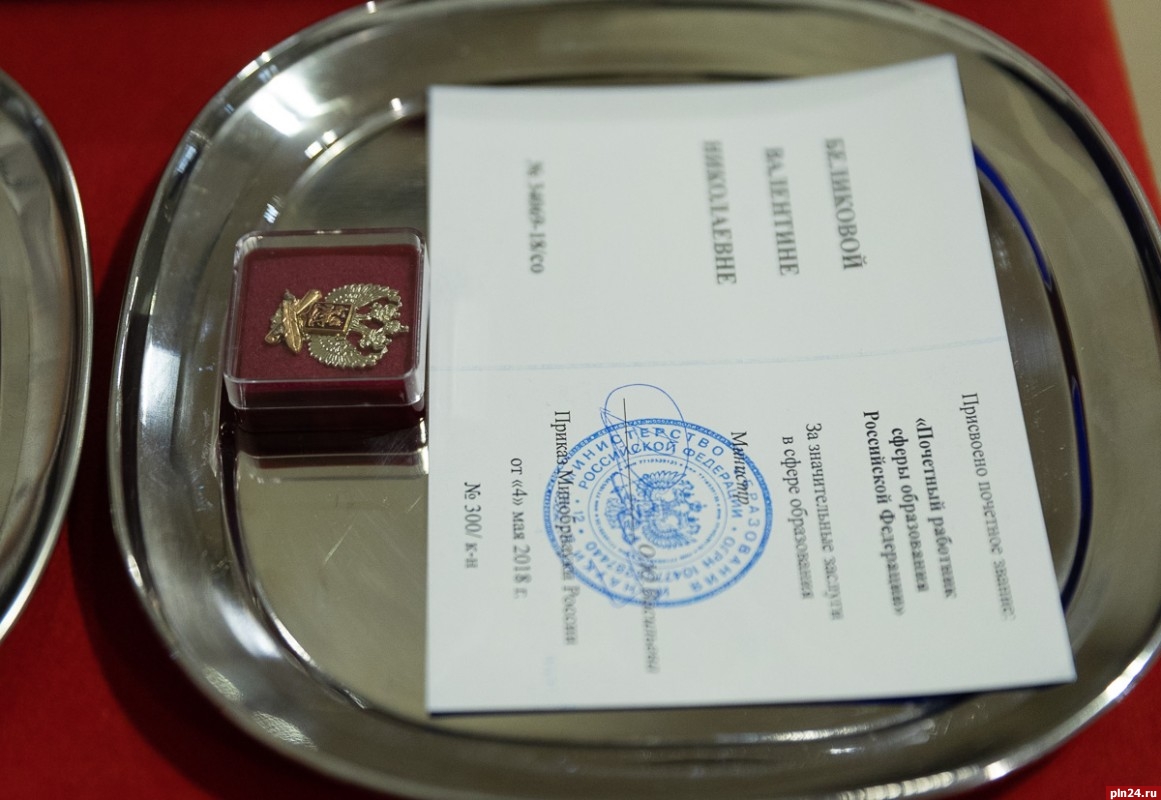 Сегодня в рамках церемонии 44 педагогических работника получили из рук губернатора Псковской области государственные и ведомственные награды: знаки «Почетный работник сферы образования Российской Федерации», Почетные грамоты министерства просвещения РФ, Почетные грамоты администрации Псковской области, дипломы победителей конкурса лучших учителей 2018 года - лауреатов премии министерства просвещения РФ и администрации Псковской области.