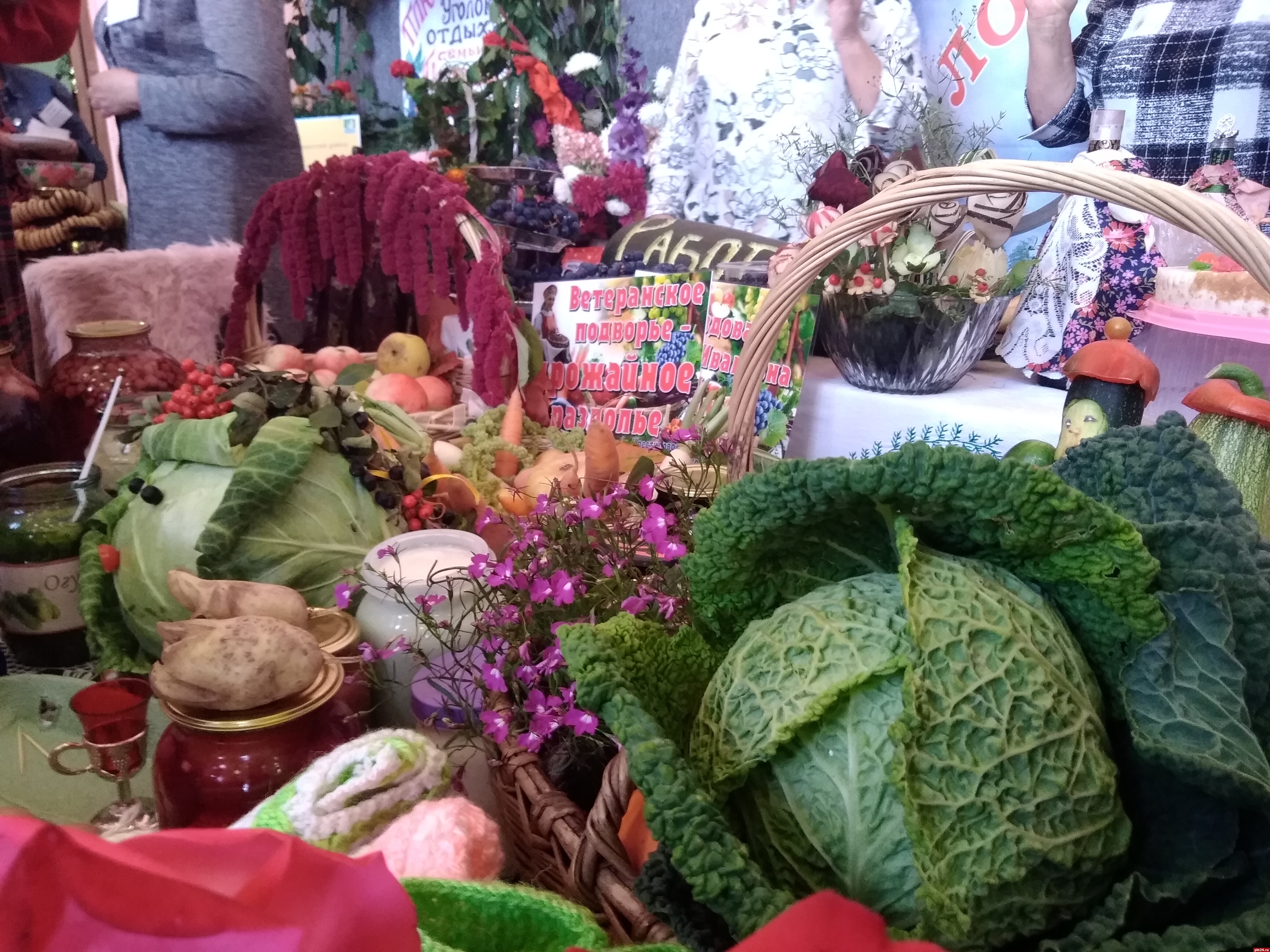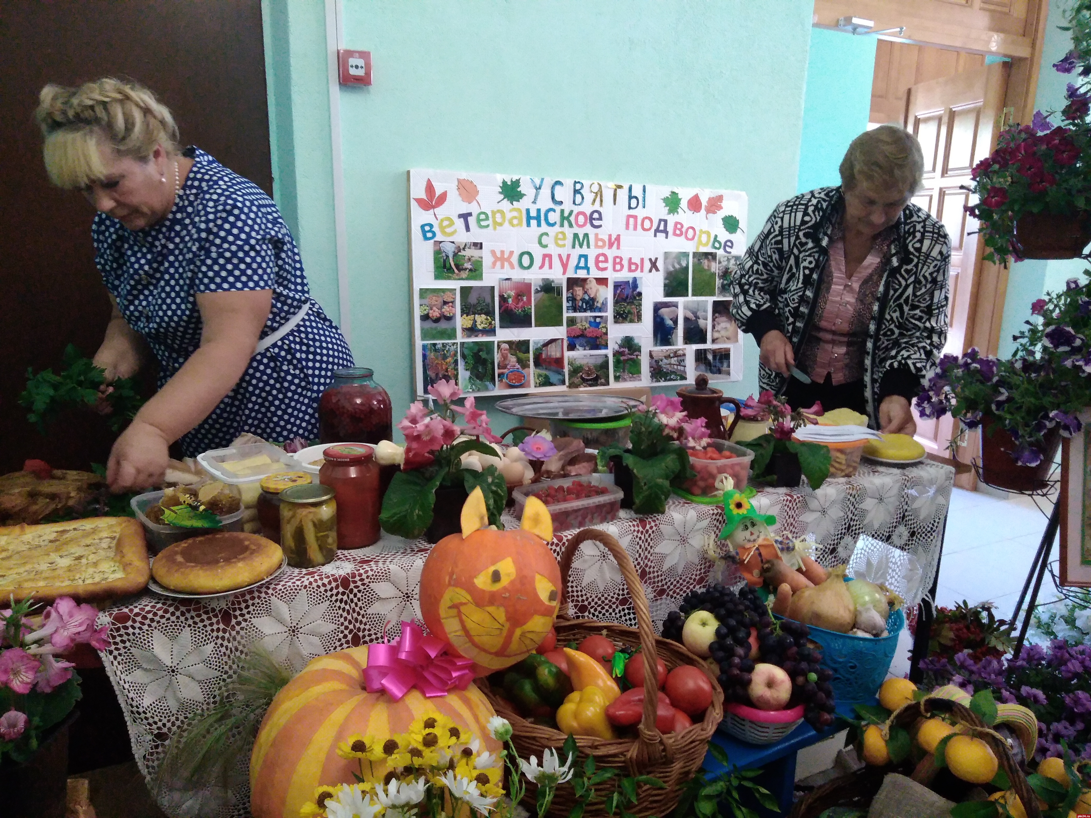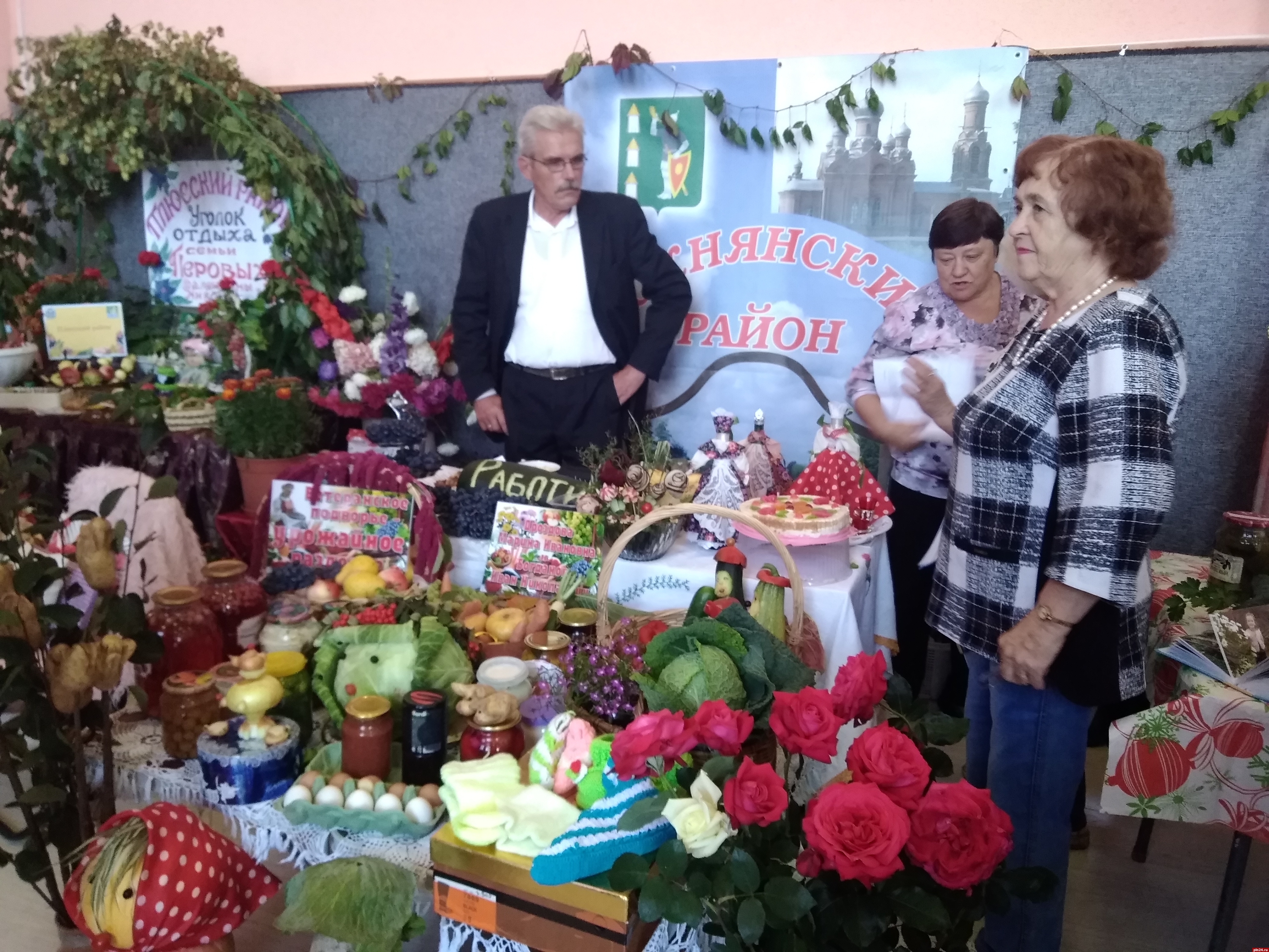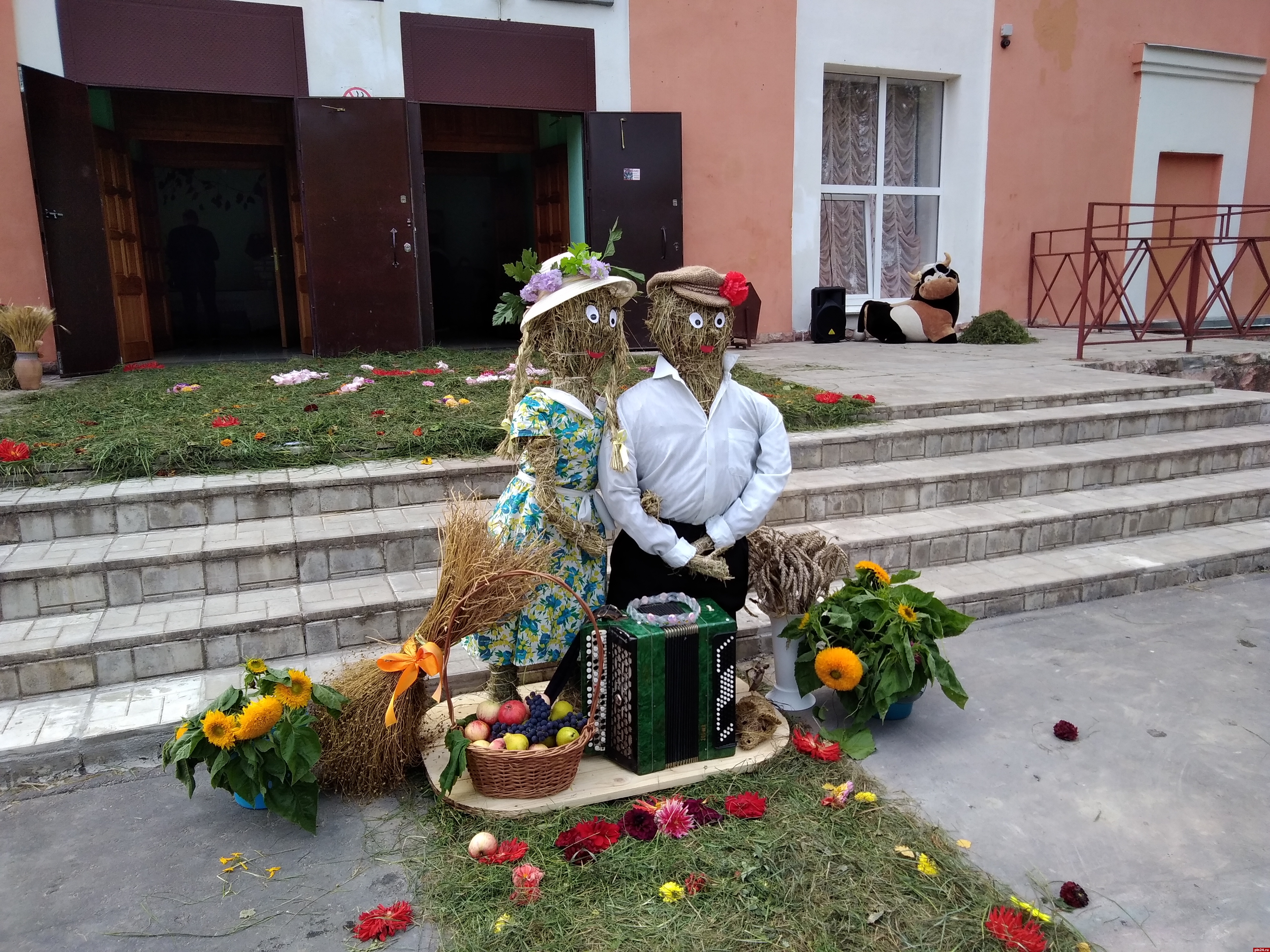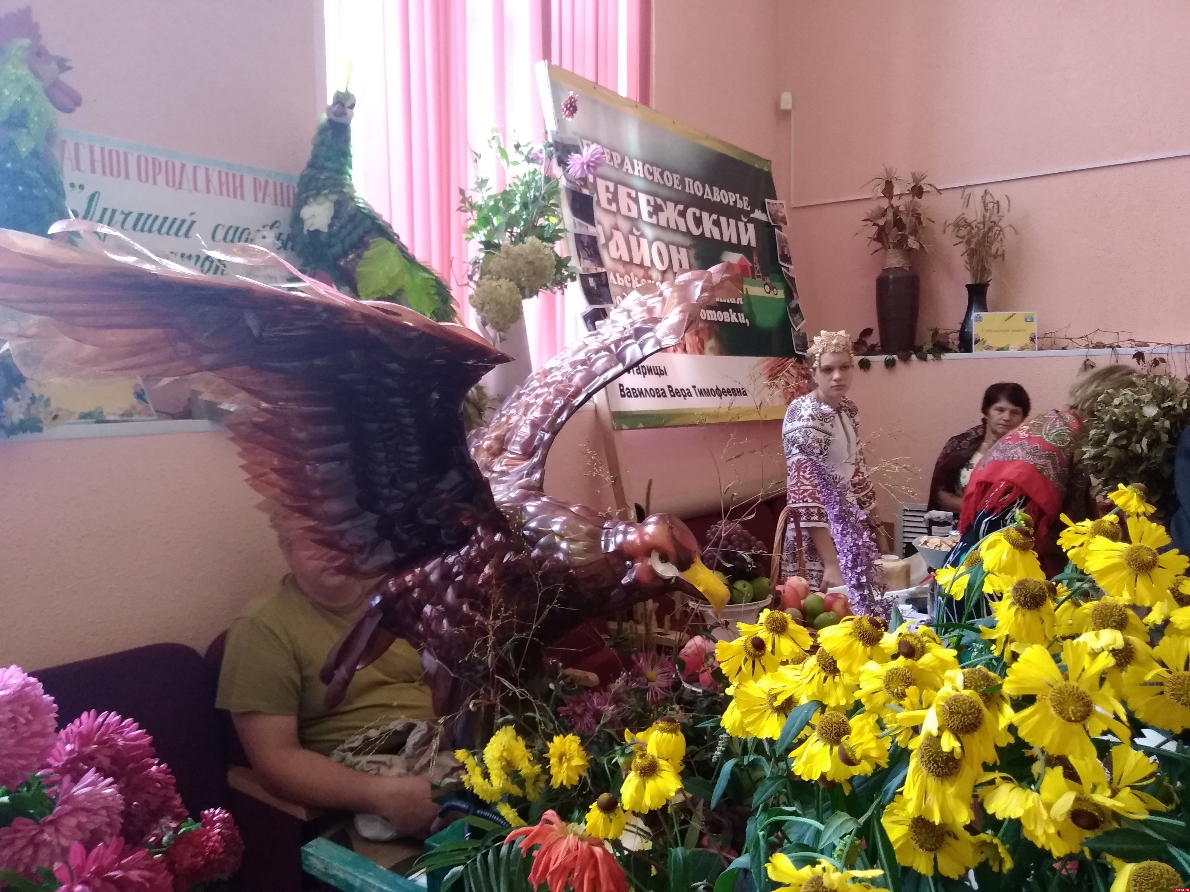 За считанные часы два пустынных холла превратились в цветущий оазис, а перед центральным входом в досуговый центр расстелилась зеленая дорожка из цветов, венчающаяся соломенными скульптурами супружеской пары - бабки да дедки, как главных героев выставки-конкурса.