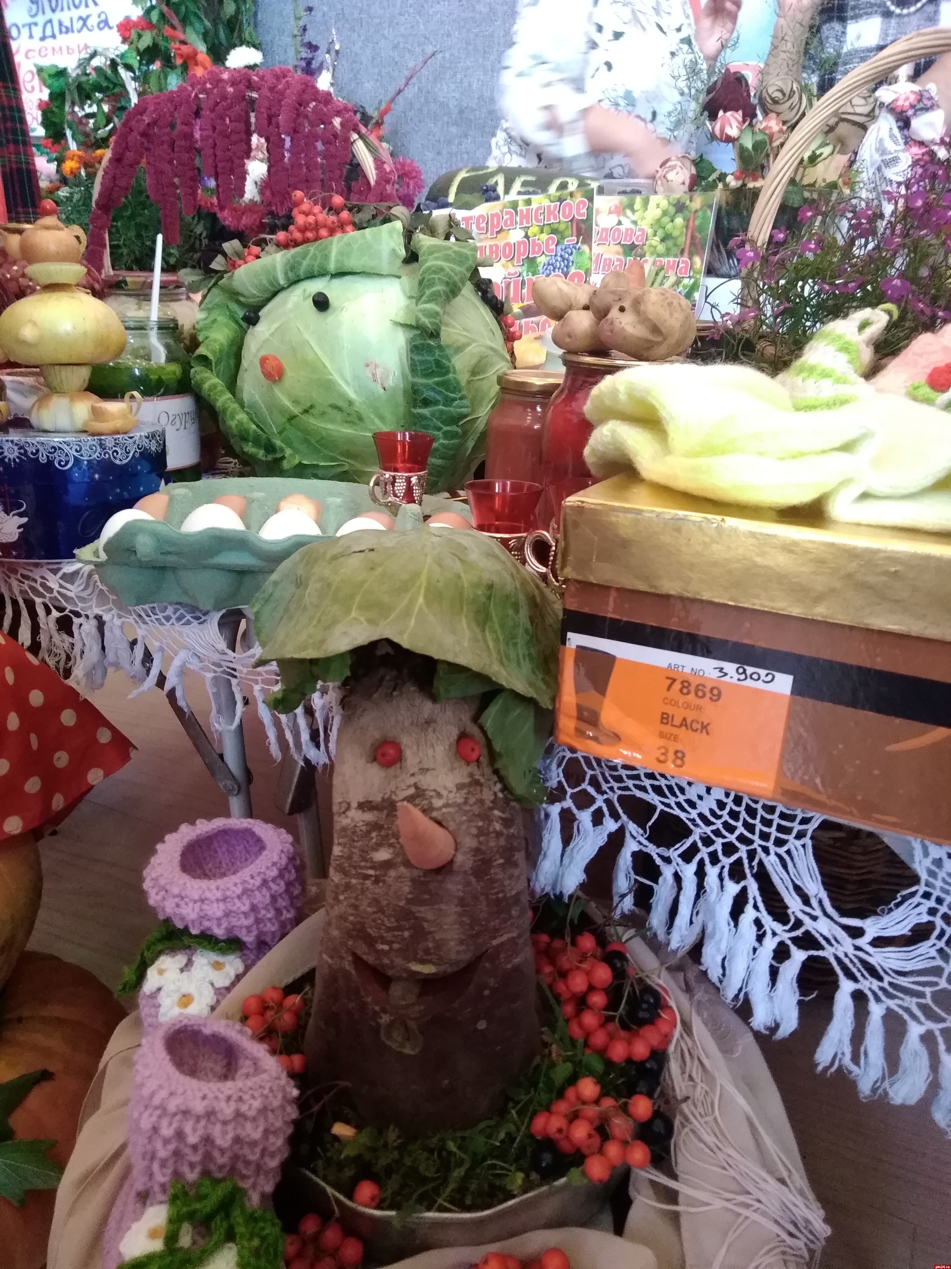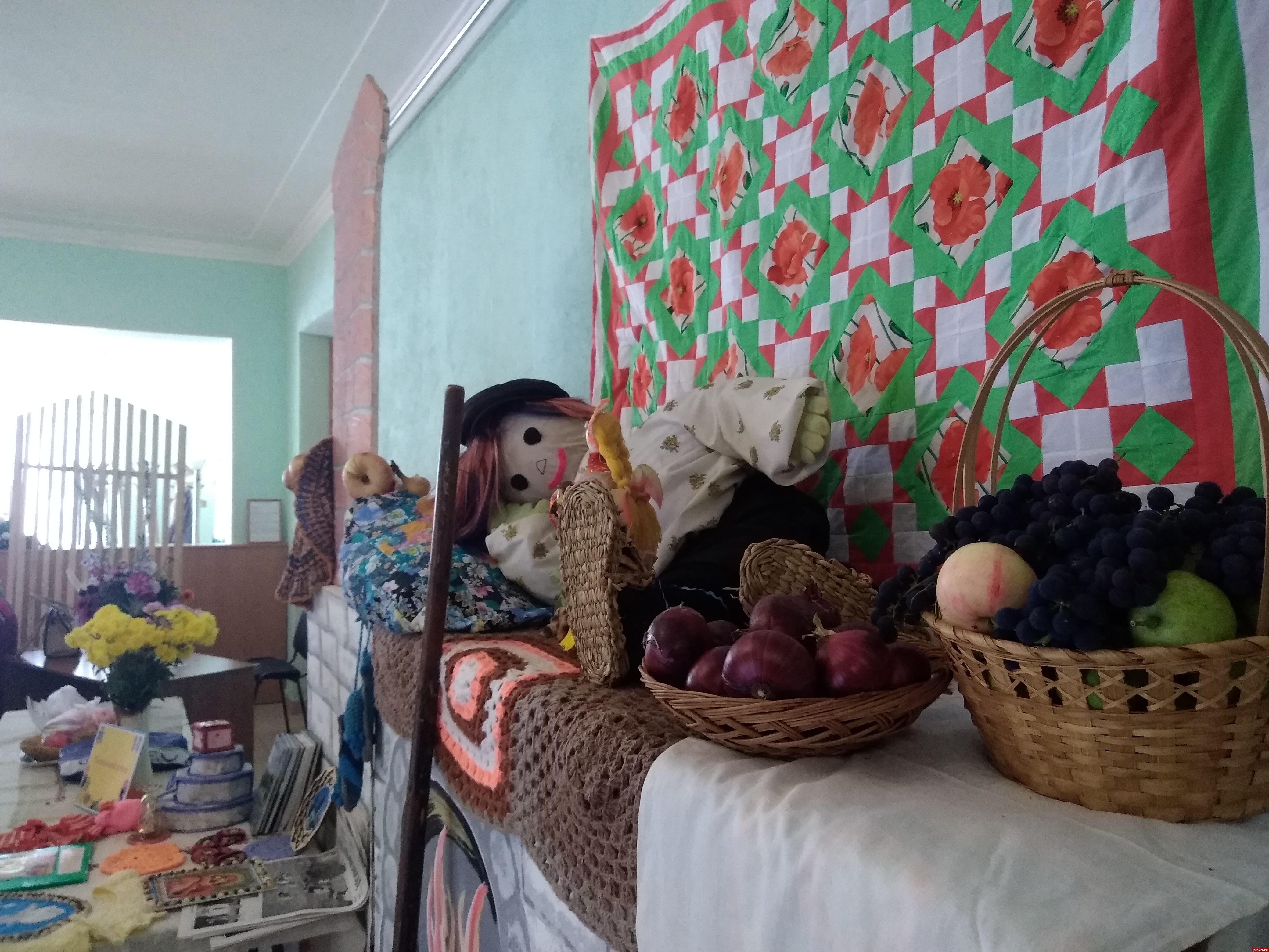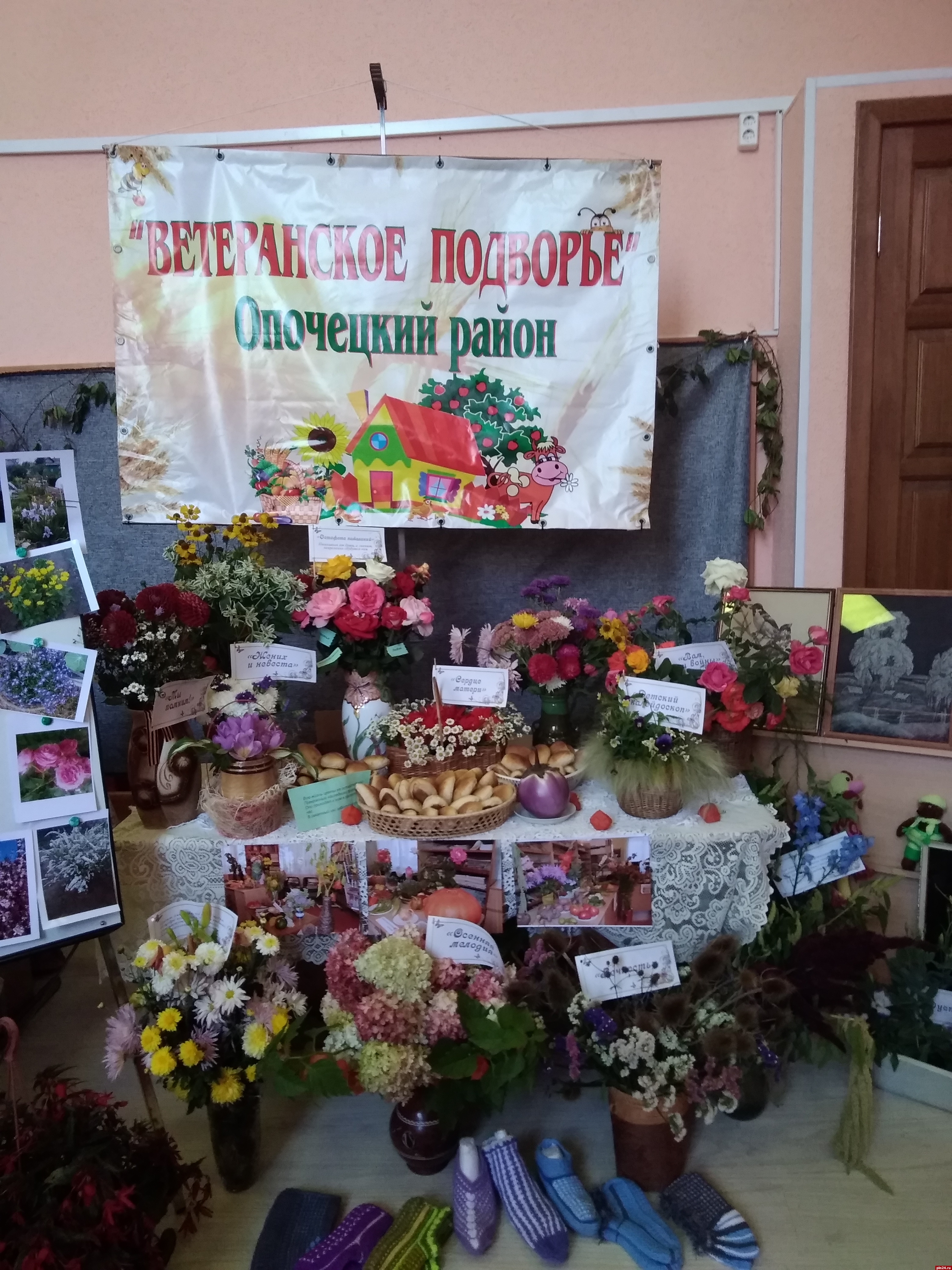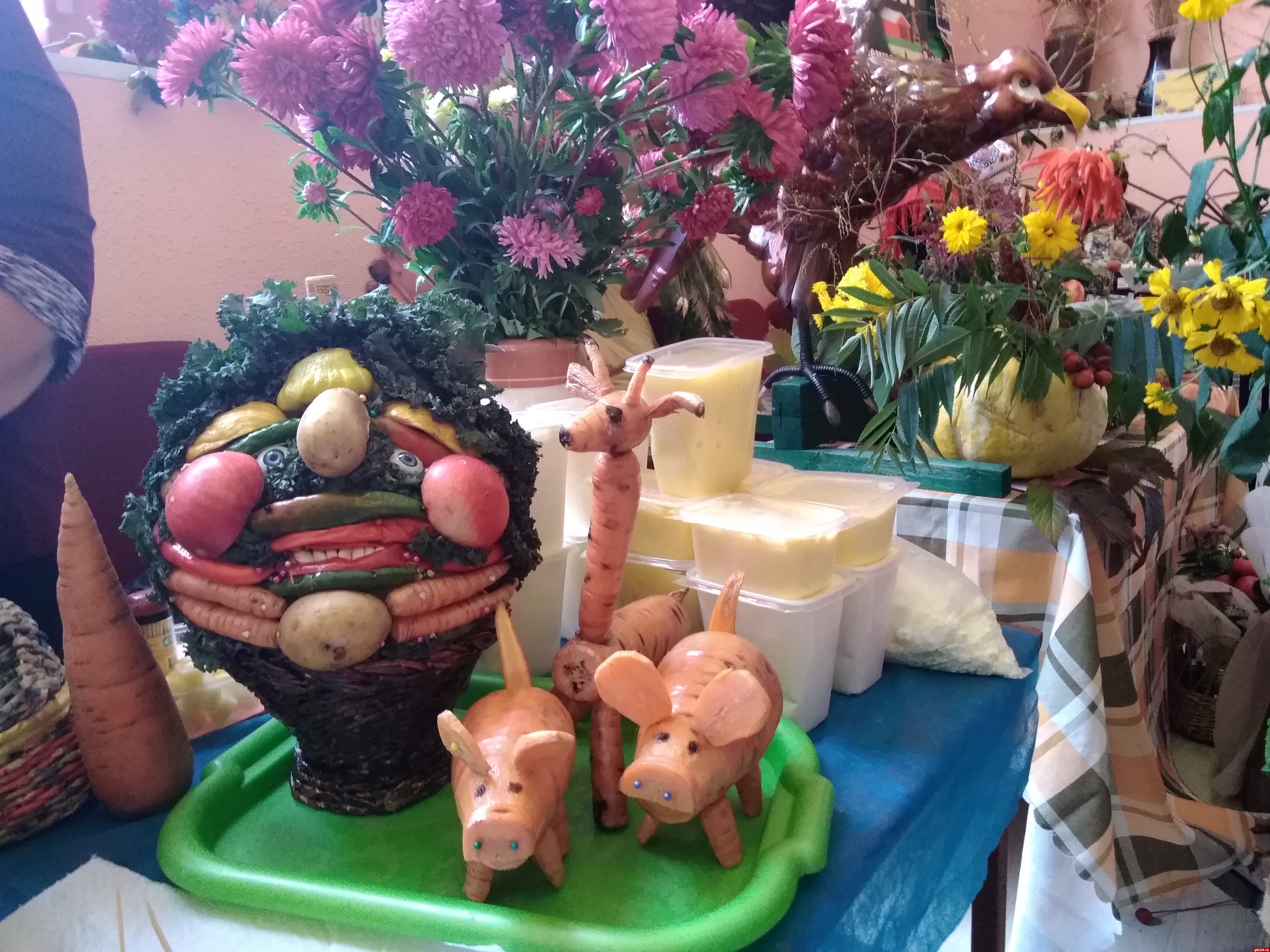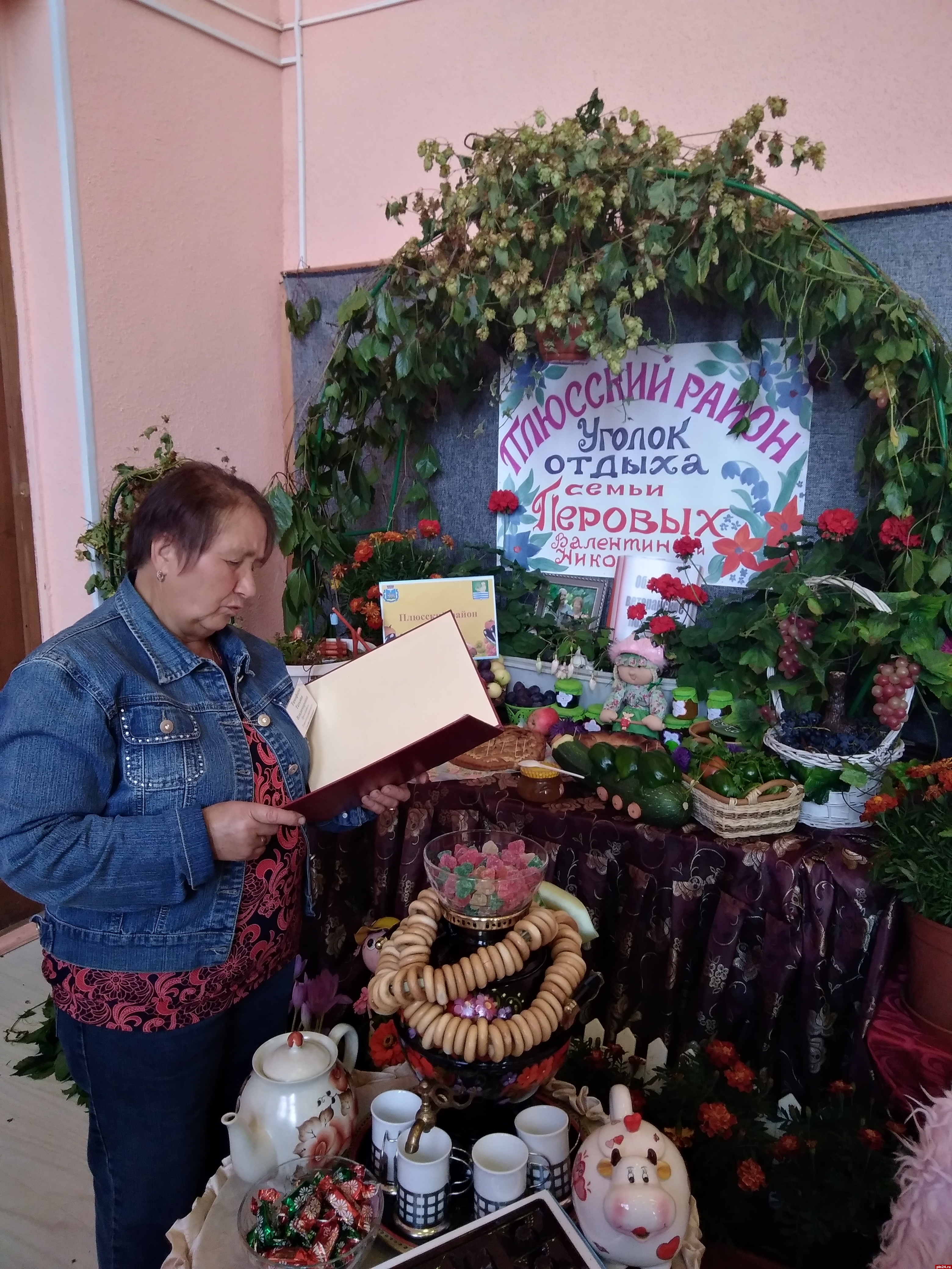 За считанные часы два пустынных холла превратились в цветущий оазис, а перед центральным входом в досуговый центр расстелилась зеленая дорожка из цветов, венчающаяся соломенными скульптурами супружеской пары - бабки да дедки, как главных героев выставки-конкурса.