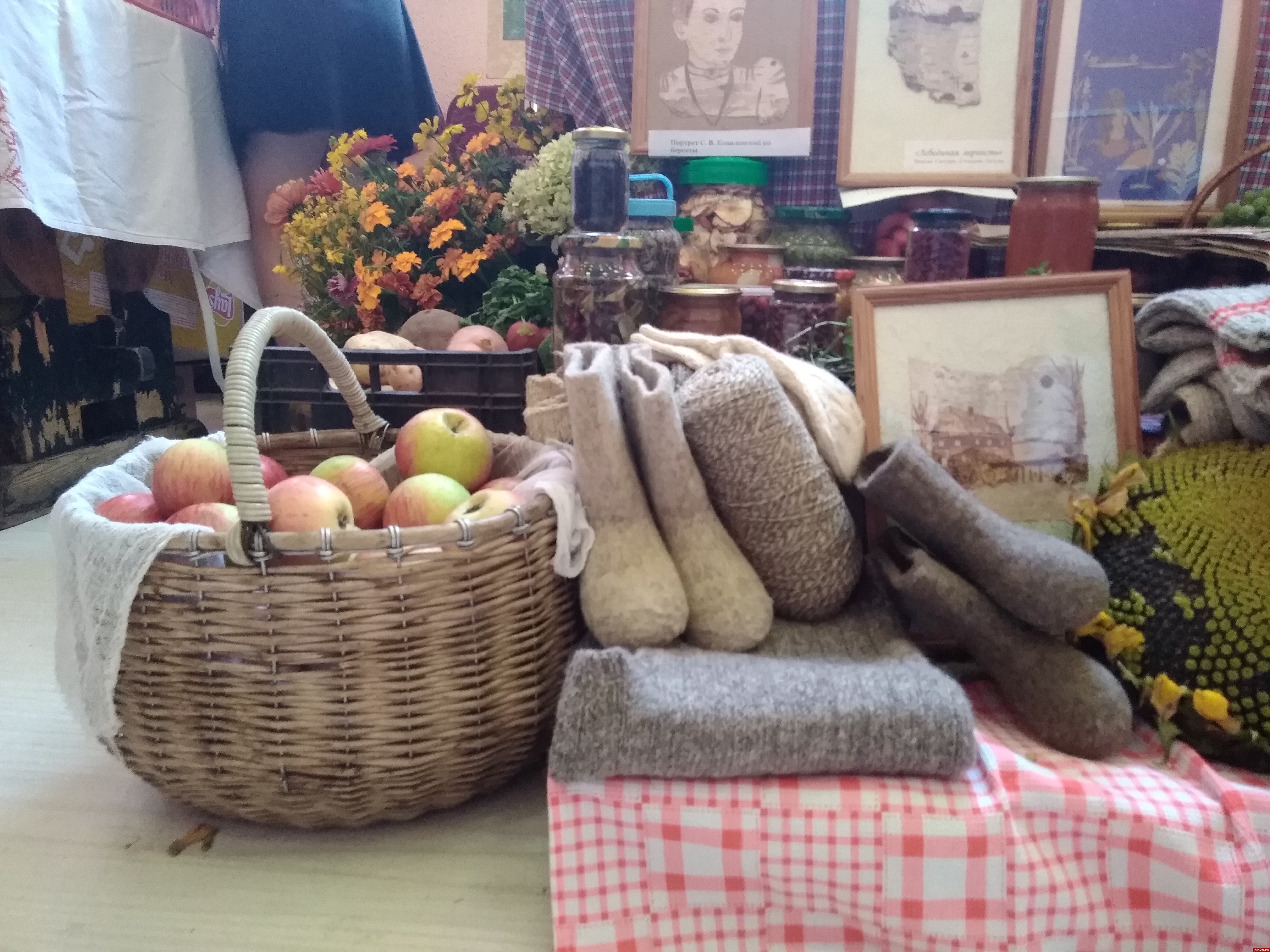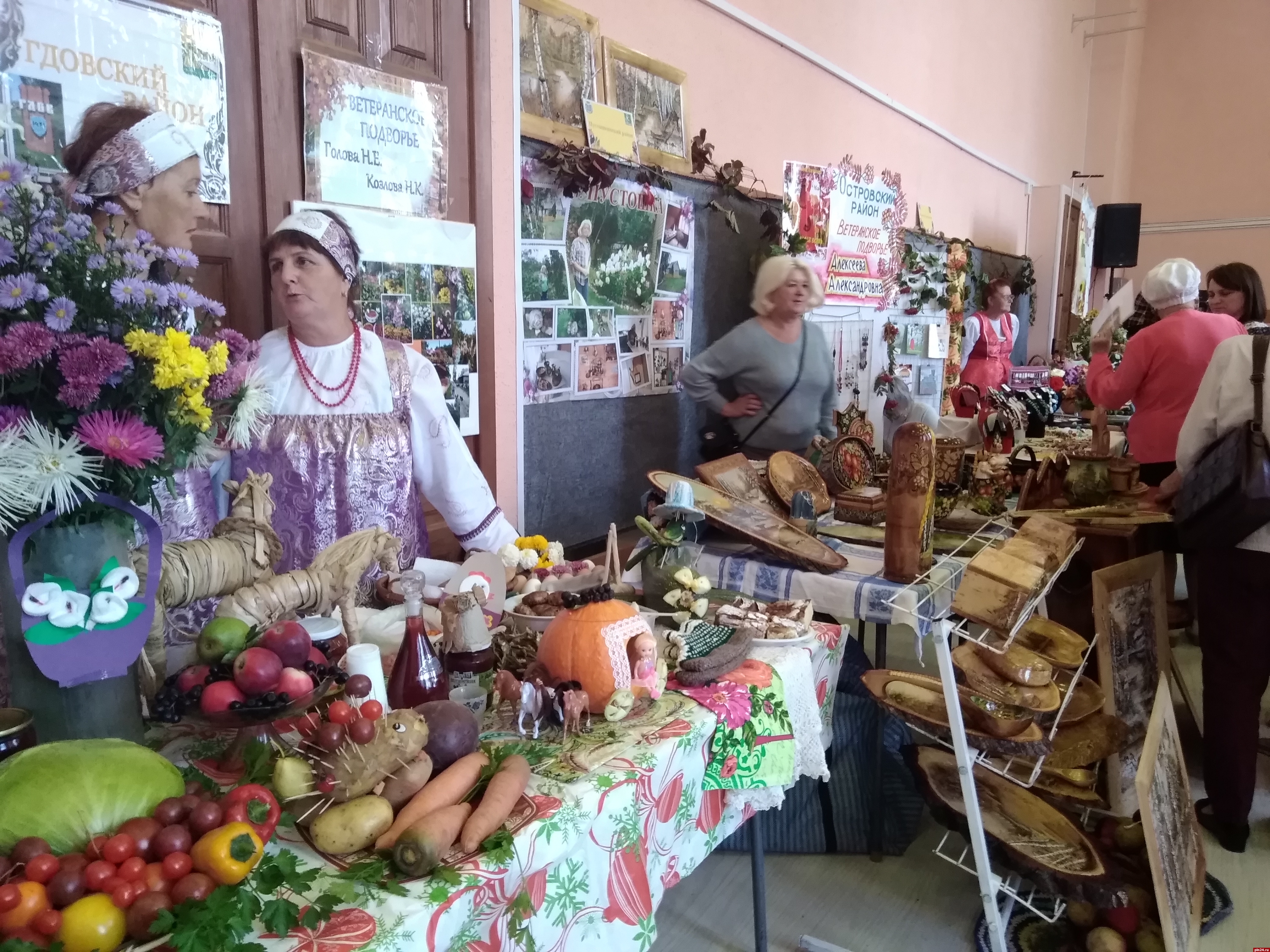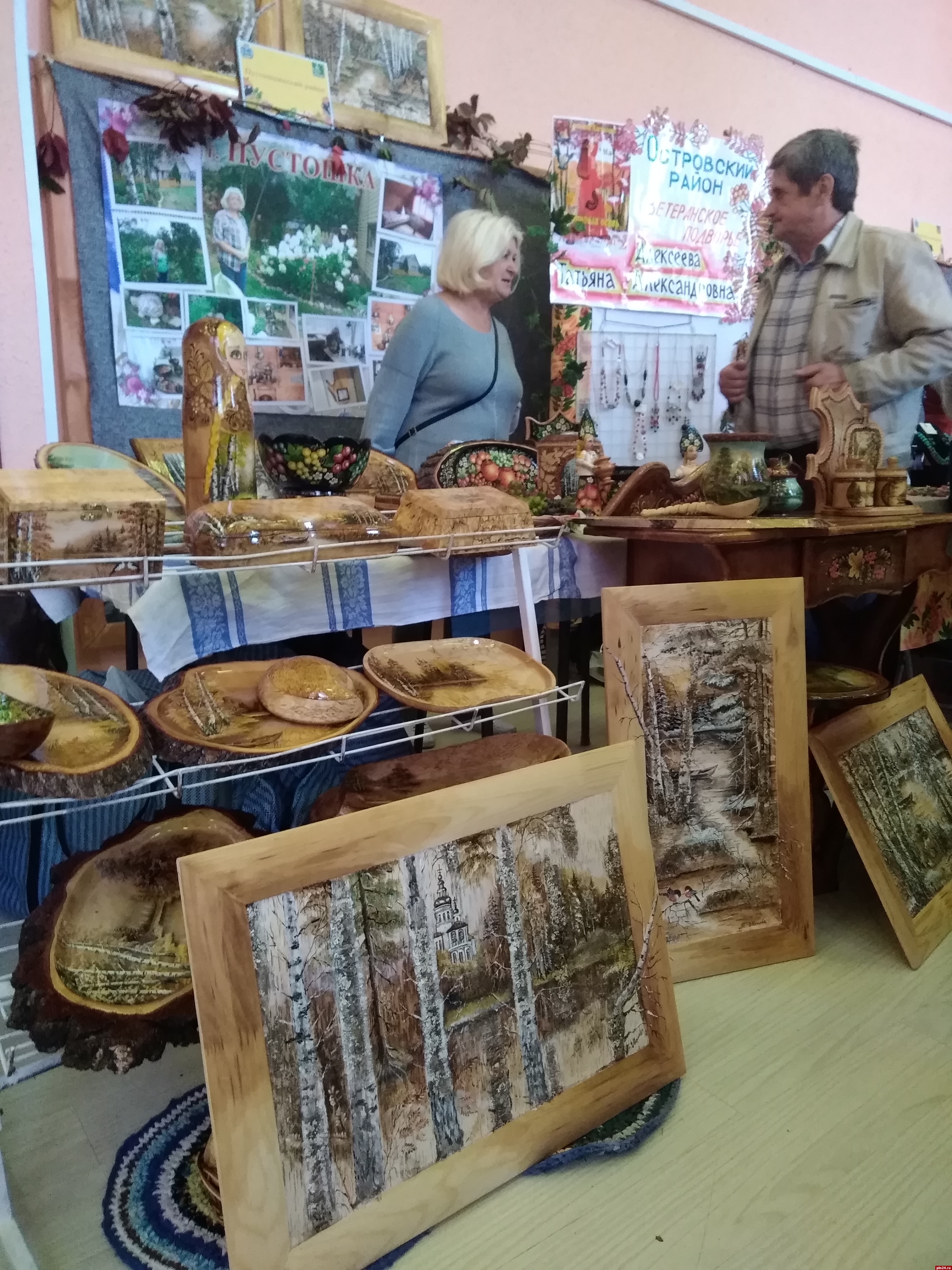 Неожиданно - среди многочисленных урожайных экспозиций - целая вереница художественных работ, выполненных в разных техниках: здесь и роспись по дереву, и резьба, и точение, и картины на бересте. Автор этих работ, Татьяна Григорьевна Иванова из Пустошкинского района, в прошлом - учитель рисования и черчения.
