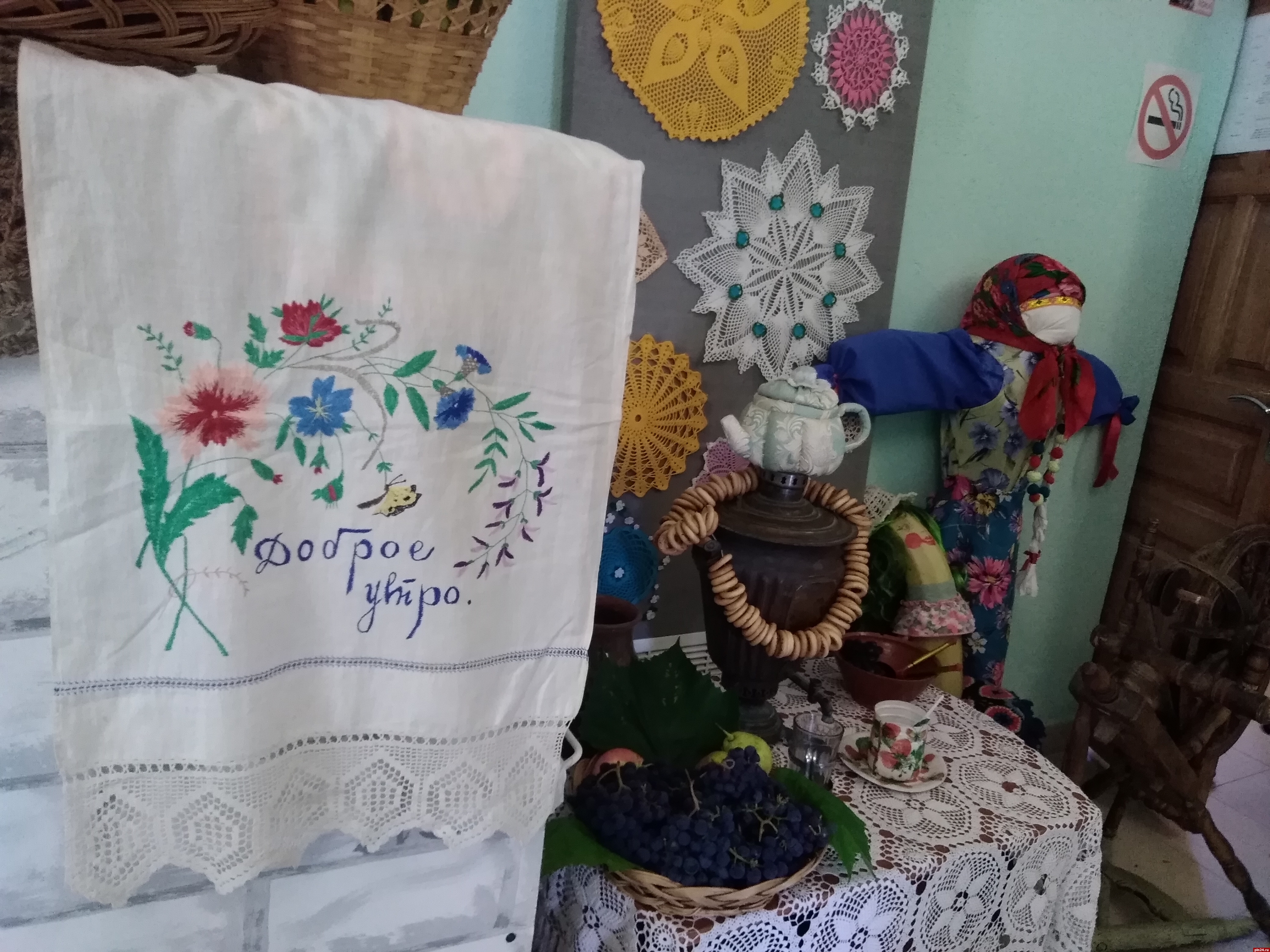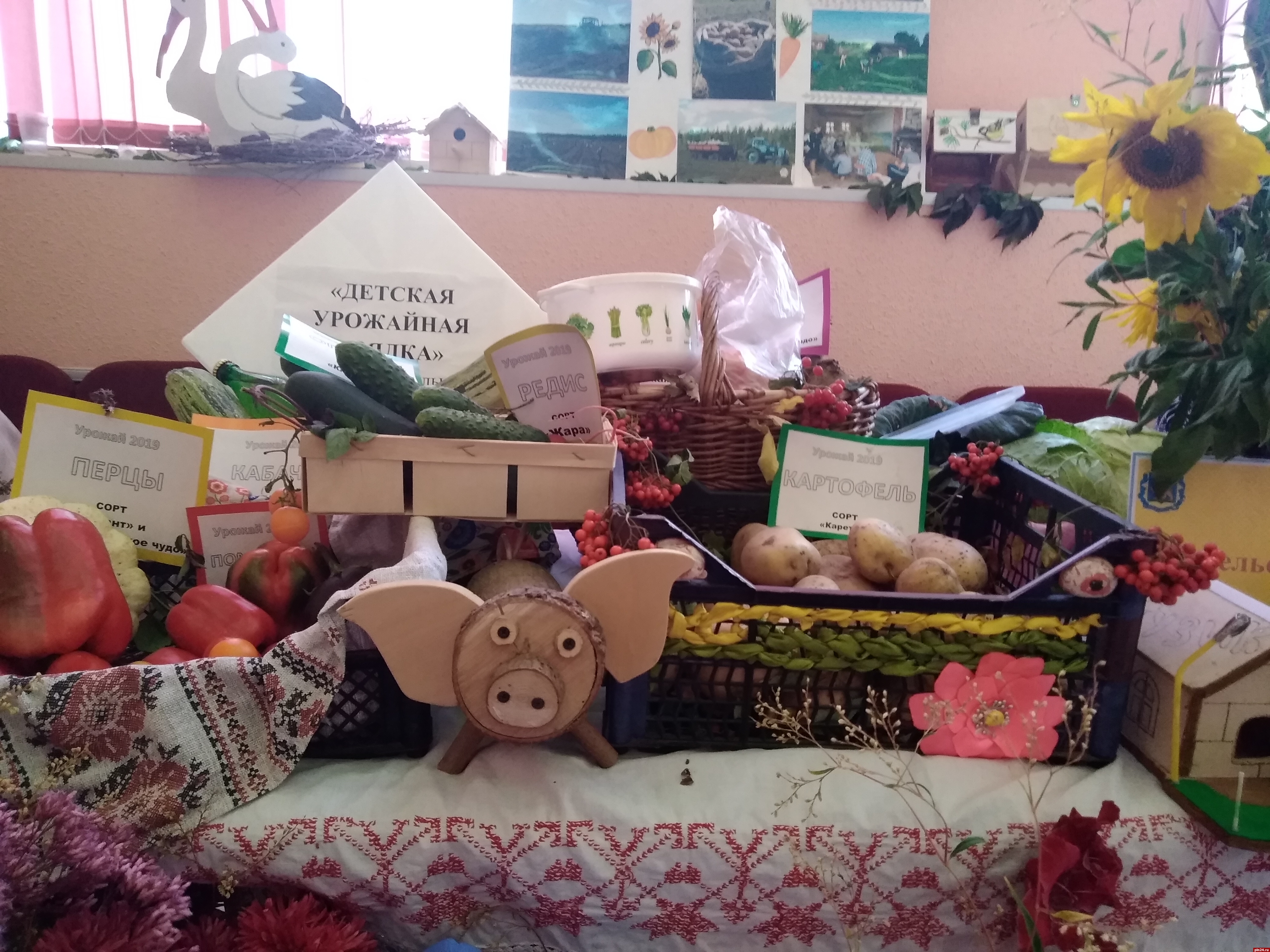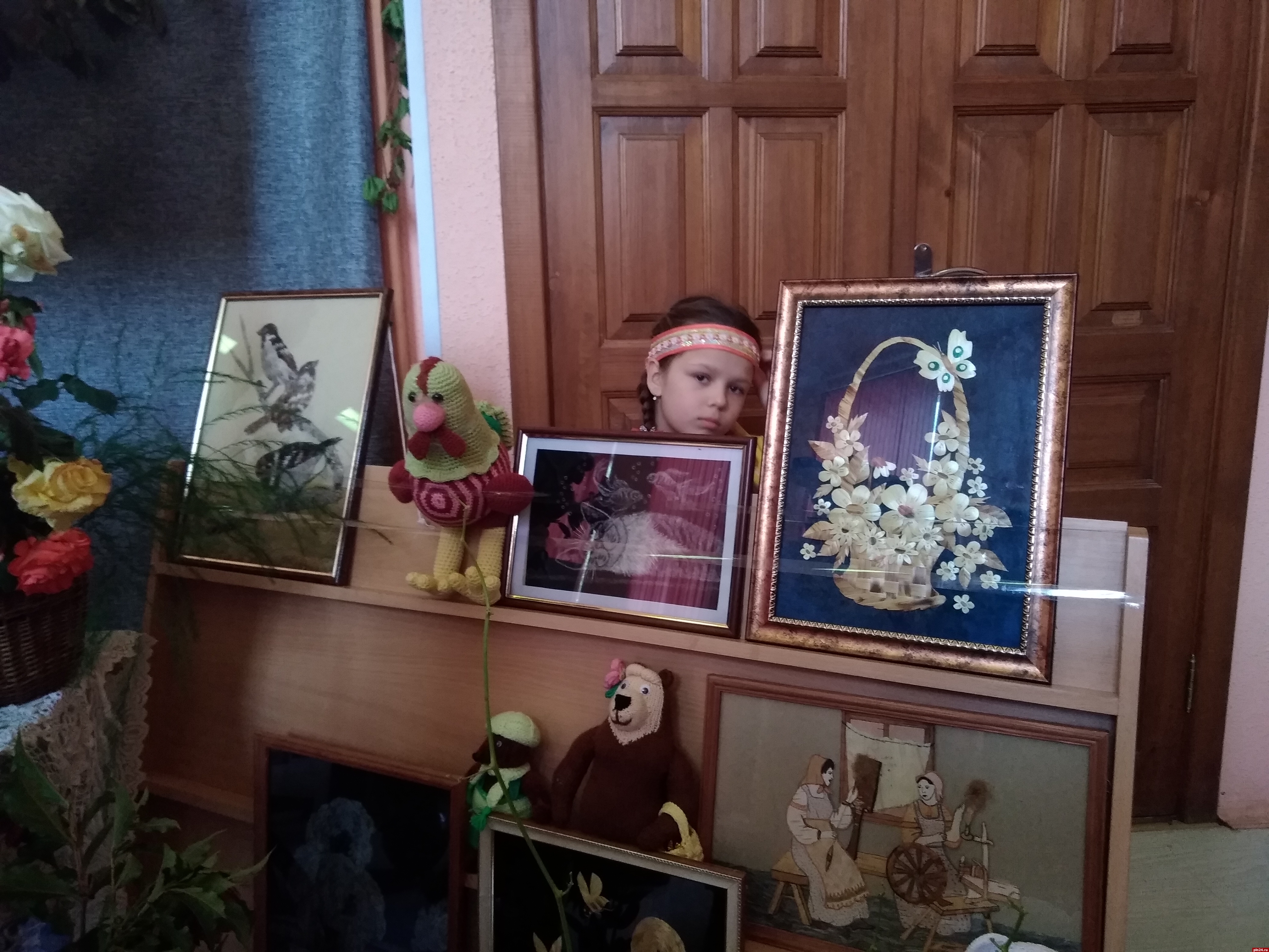 Неожиданно - среди многочисленных урожайных экспозиций - целая вереница художественных работ, выполненных в разных техниках: здесь и роспись по дереву, и резьба, и точение, и картины на бересте. Автор этих работ, Татьяна Григорьевна Иванова из Пустошкинского района, в прошлом - учитель рисования и черчения.