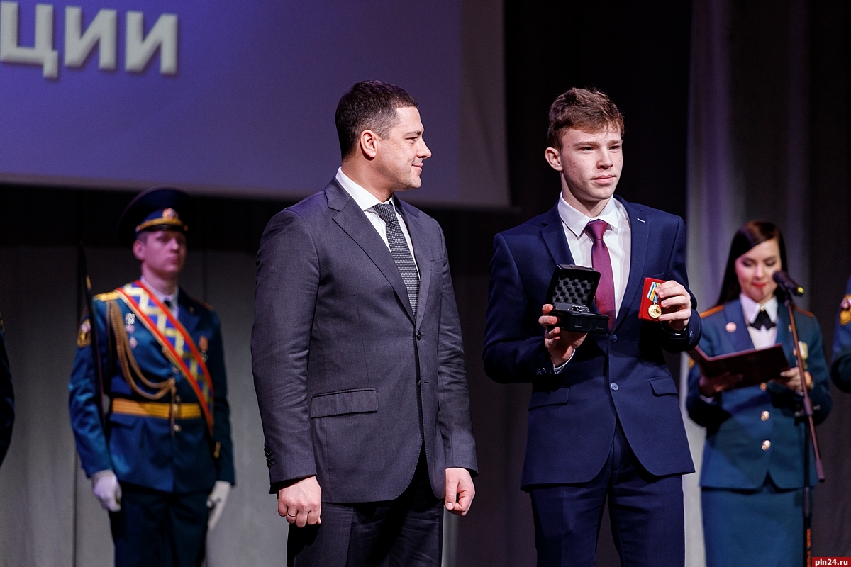 Медали «За проявленную смелость, отвагу и самоотверженность при спасении человека на воде» из рук главы региона получили псковичи Руслан Коноплев и Иван Степанов.