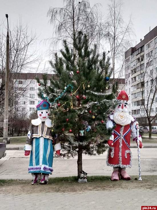 Елку в псковском дворе на Рижском проспекте украсили не просто игрушками - рядом с новогодним деревом поставили Деда Мороза и Снегурочку.