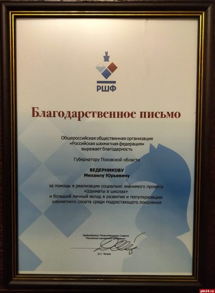 В связи с этим Дмитрий Песков наградил губернатора Псковской области Михаила Ведерникова благодарственным письмом ФШР «за помощь в реализации социально значимого проекта «Шахматы в школах» и большой личный вклад в популяризацию и развитие шахматного спорта среди подрастающего поколения».