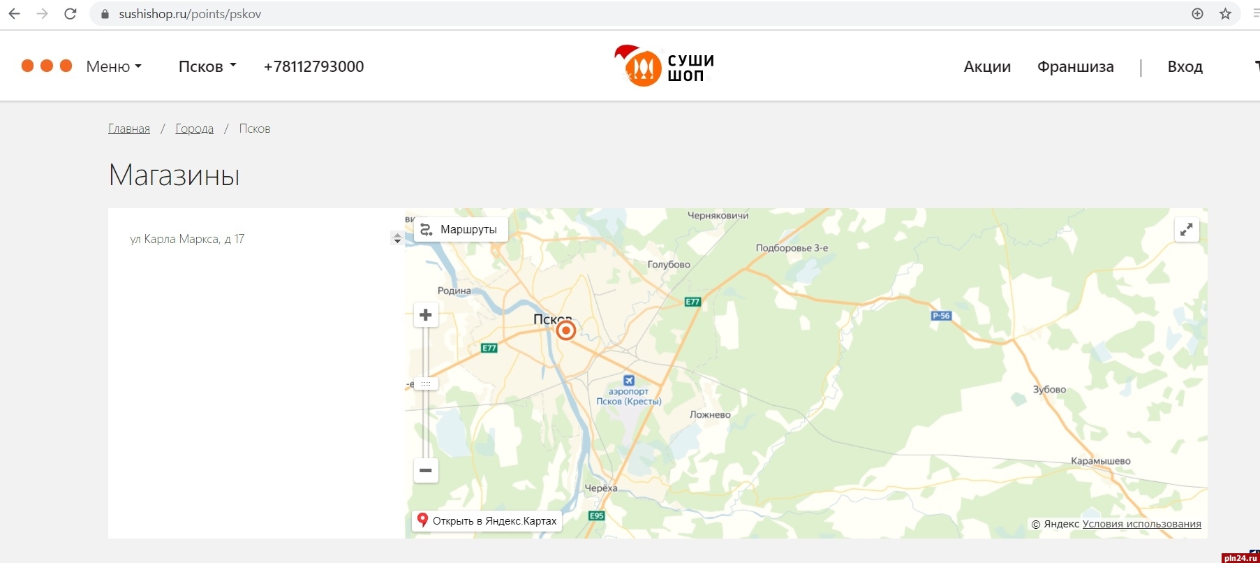По информации на официальном сайте сети общепита, в Пскове теперь работает только одно кафе «Сушишоп» на Карла Маркса, 17.