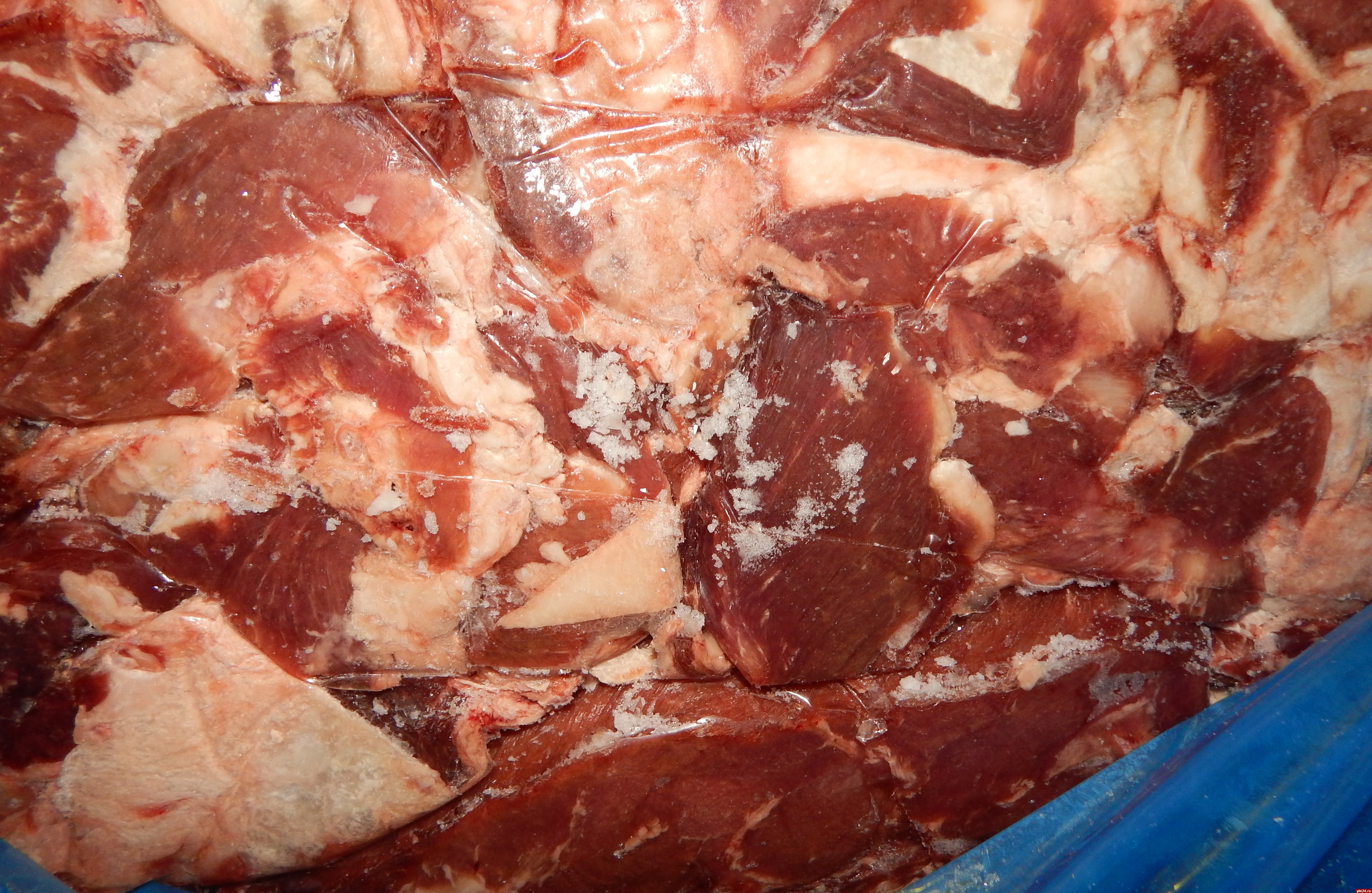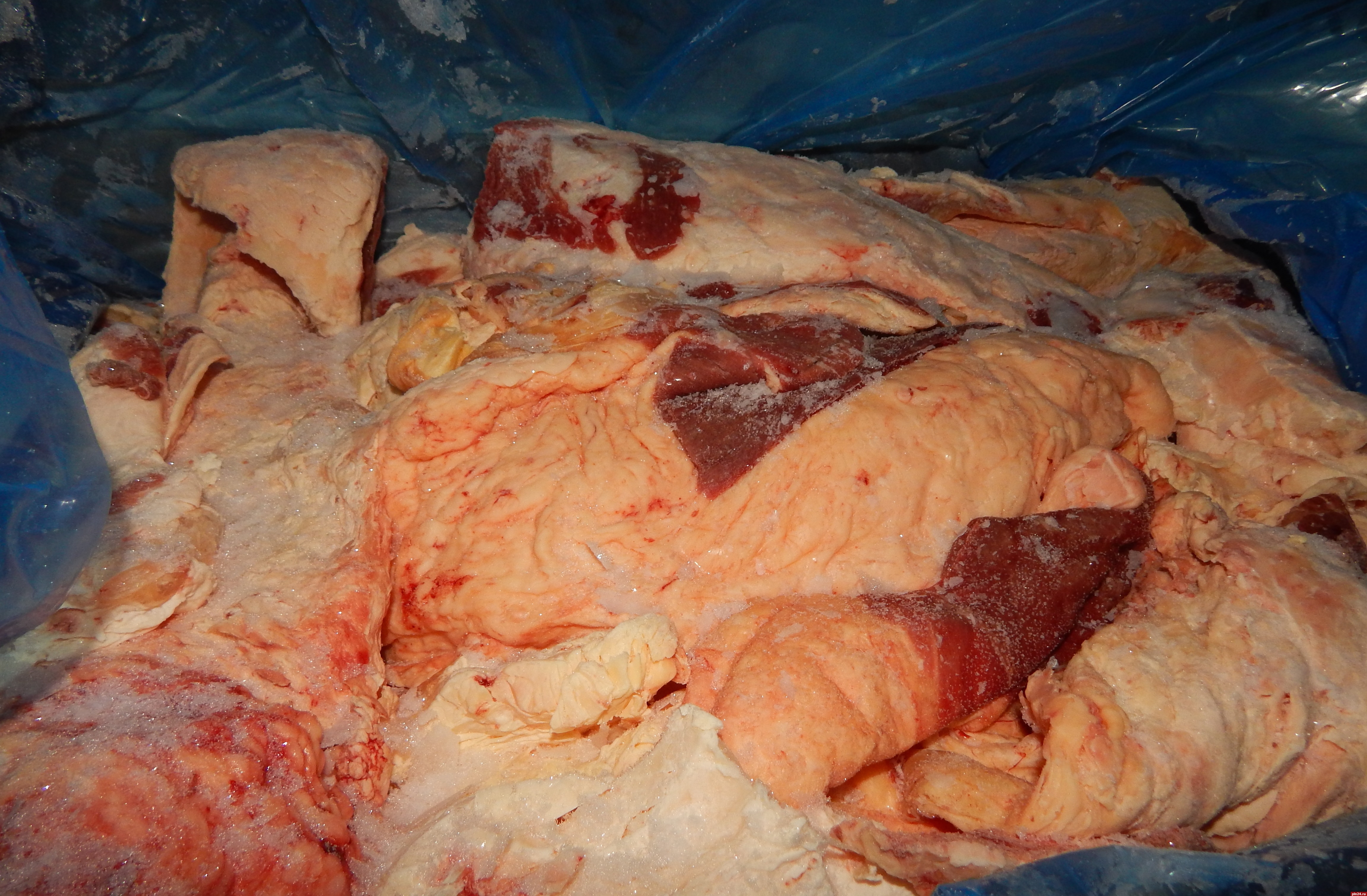 Продукция, содержащая в упаковке, по органолептическим показателям не соответствовала сведениям, заявленным в товаросопроводительных документах. А именно, вместо заявленного в документах и указанного на маркировке товара говяжьего жира, внутри коробки был обнаружен замороженный блок, состоящий из кусков различной формы, с преобладающим содержанием мышечной ткани темно-красного цвета.