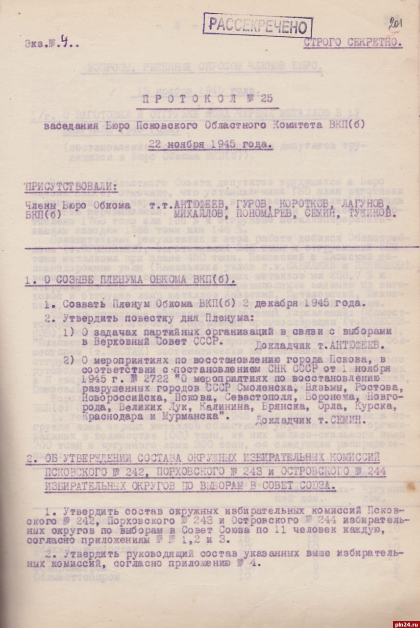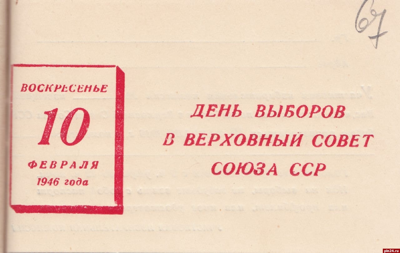 Избирательная комиссия Псковской области начинает знакомство жителей региона с уникальными архивными документами по первым послевоенным выборам 10 февраля 1946 года в Верховный Совет СССР.
