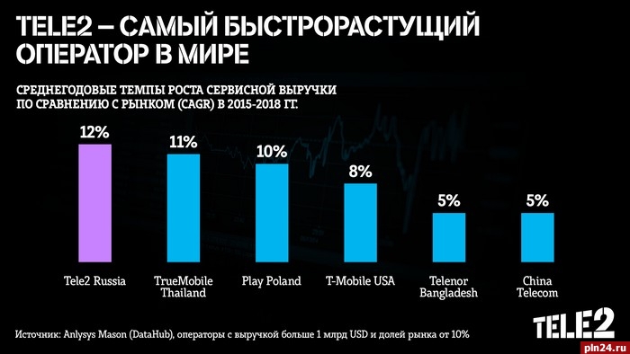 Tele2 является самым быстрорастущим зрелым оператором в мире. Заключение сделано на основе банка данных Analysys Mason – международной компании, которая специализируется на консалтинговых услугах в телекоммуникациях и медиа. В 2015-2018 гг. Tele2 демонстрировала среднегодовые темпы роста сервисной выручки в номинальном выражении относительно рынка в 12%, что ставит компанию на первое место по динамике среди мировых операторов.