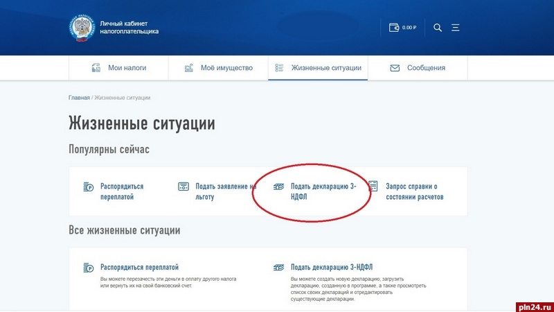 Для заполнения и направления декларации необходимо воспользоваться разделом «Подать декларацию 3 НДФЛ» блока «Жизненные ситуации». Сервис позволяет заполнить декларацию в режиме онлайн (реквизиты налогоплательщика и данные из сведений о доходах, представленных налоговым агентом, заполняются автоматически) либо вложить электронный файл декларации, заполненной в специальной программе «Декларация» (в этом случае все данные заносятся вручную, но предусмотрен автоматизированный контроль введенных данных).