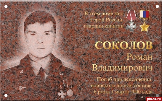 Добавим, Роман Владимирович Соколов - гвардии капитан, заместитель командира роты по воздушно-десантной подготовке родился 16 февраля 1972 года в Рязани. Мечтал поступить в высшее командное училище ВДВ в родном городе. Эта мечта осуществилась 1 августа 1989 года. Окончив училище, он был направлен к месту службы в Псков в 76-ю гвардейскую Краснознаменную дивизию. В 1995 году Роман Соколов участвовал в первой операции по наведению конституционного порядка в Чеченской республике. Сражаясь в Аргунском ущелье, получил ранение в руку и контузию. Был награжден орденом Мужества и медалью «За боевые заслуги». В 2000 году новая командировка в Чечню. 29 февраля 6-я рота десантников, выполняя приказ, выдвигалась на господствующие высоты у выхода из Аргунского ущелья. Капитан Соколов возглавил два взвода и отошел с ними на высоту 776.0 под шквальным огнем. После гибели командира 6-й роты гвардии майора Молодова, командование принял гвардии капитан Соколов, хотя уже был ранен. Ночью 1 марта боевики пытались окружить роту. Гвардии капитан Соколов до последнего не прекращал сражаться. Однако все было тщетно. Смертельная мина ударила в спину. За мужество и героизм, проявленные в боях с террористами, гвардии капитану Роману Соколову присвоено звание Герой России (посмертно).