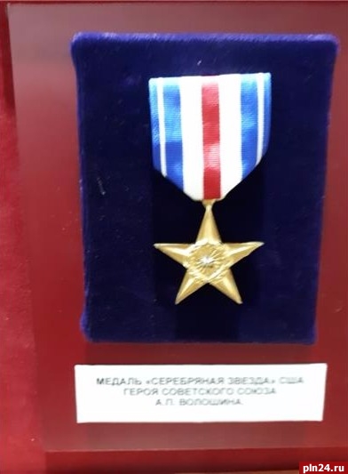 Особого внимания заслуживают наградные документы – удостоверение к золотой звезде Героя Советского Союза и свидетельство к серебряной звезде США. Американской награды Алексей Волошин был удостоен по решению президента Рузвельта за мужество и отвагу, проявленные в бою. В свидетельстве, которое экспонируется в музее, есть надпись на английском язык: «Когда вы видите человека с такой наградой, вы обязаны его приветствовать».
