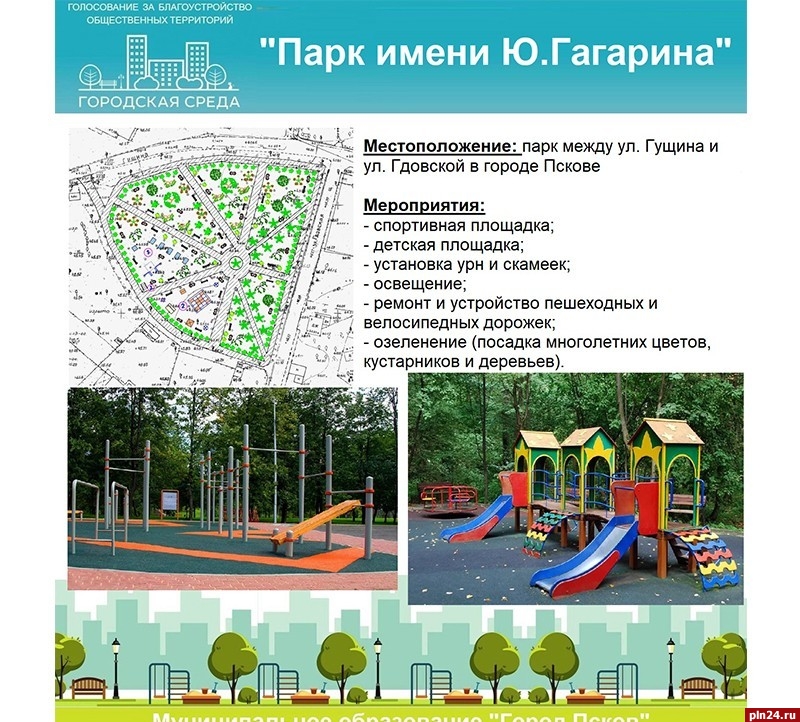 На текущий момент с незначительным отрывом в голосовании побеждает «Парк им. Ю.Гагарина», который расположен в Пскове на лице Гущина. Результаты голосования на данный момент: