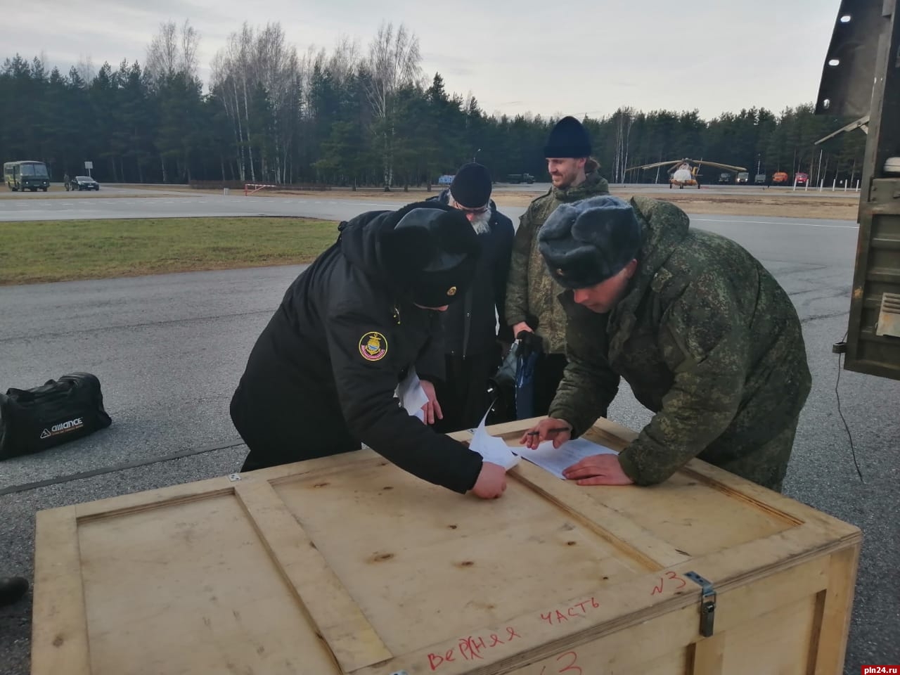 Накануне, на военный аэродром в Санкт-Петербурге, приземлился самолет с иконой на борту, где ее передали военнослужащим соединения для доставки в Псков.