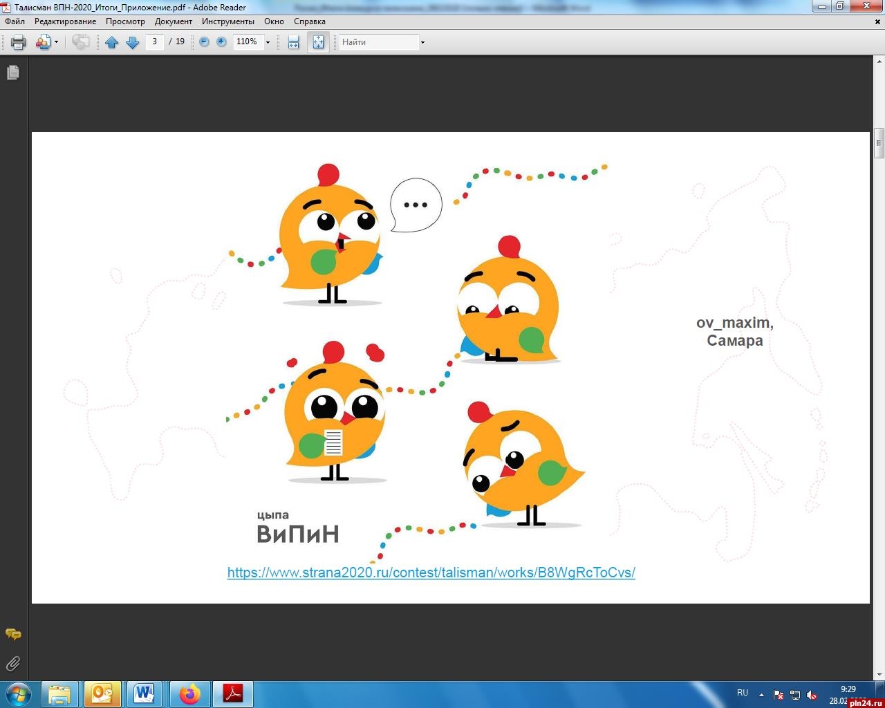 Для участия в конкурсе было представлено около 900 вариантов талисмана будущей переписи из 74 регионов нашей страны. Заботливые аисты, мудрые филины, зовущие в неведомую даль жар-птицы, косолапые медведи, харизматичные кони в яблоках и другие персонажи были достойны стать символом будущей переписи. Но победитель конкурса должен быть один, и им стала птичка «Цыпа ВиПиН», автором которой является архитектор, иллюстратор из Самары ov_maxim. Именно его работу жюри конкурса признало лучшим вариантом талисмана Всероссийской переписи населения 2020 года. Поздравляем Максима с победой! Его ожидает денежный приз в размере 60 тысяч рублей.