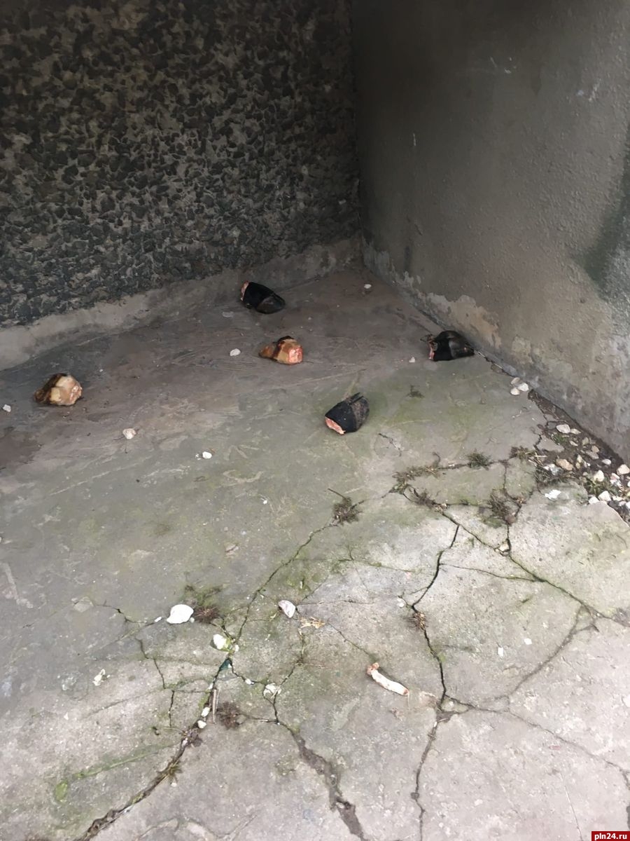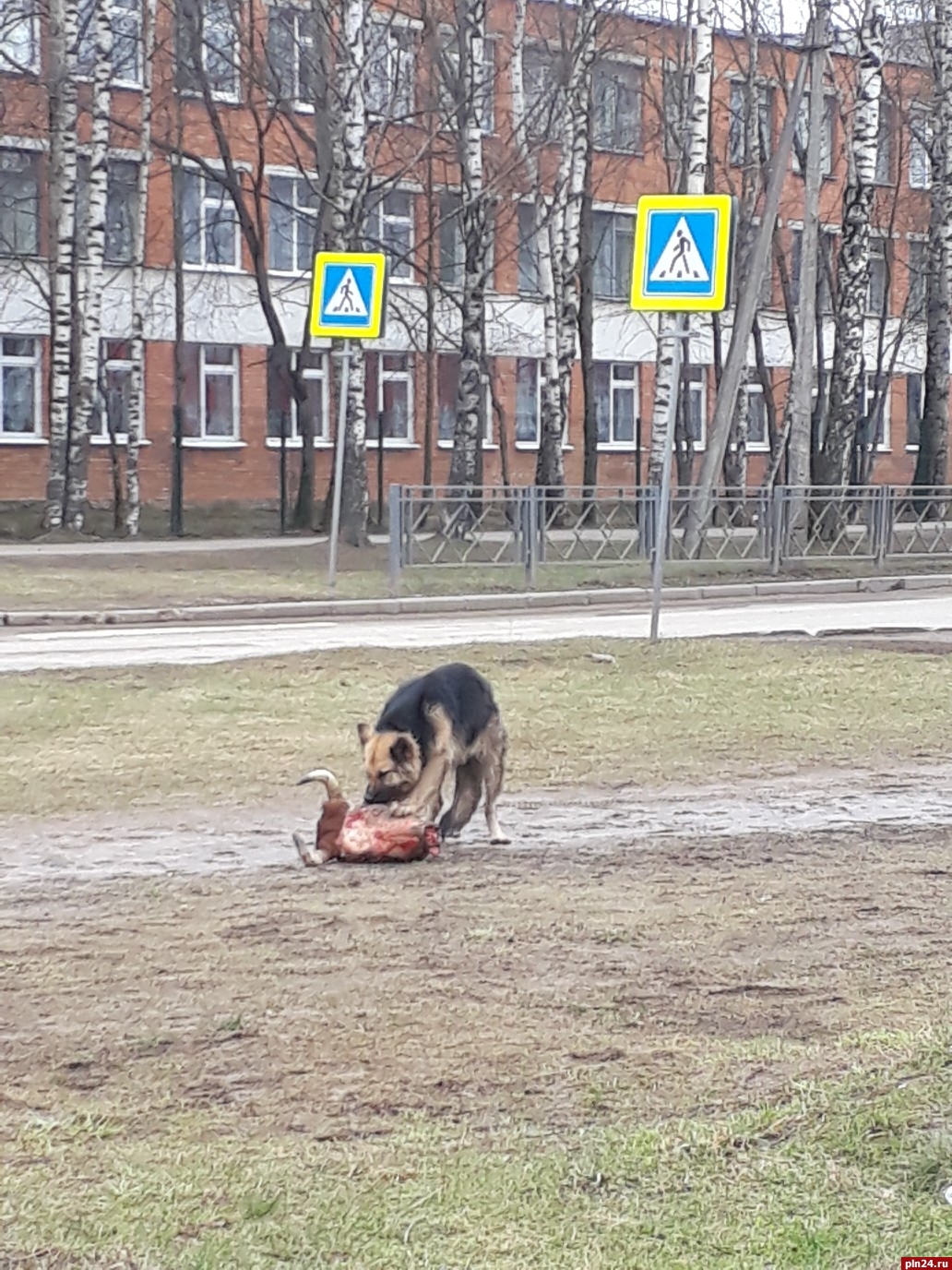 Жители Пскова возмутила фотография собаки, грызущей коровью голову прямо напротив школы №22 (погранично-таможенно-правового Лицея) и жилых домов на улице Алтаева. Фото опубликовано в группе «Инцидент Псков» в соцсети ВКонтакте.