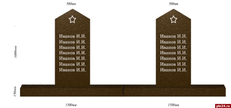 Еще две стелы (60*20*15см) из того же материала будут установлены на входе в мемориал. На них будет размещен следующий текст: «За мужество, стойкость, массовый героизм и большой вклад в партизанское движение против немецко-фашистских захватчиков, проявленные в годы Великой Отечественной войны 1941-1945 гг. Указом губернатора области от 29 июня 2018 года №42-УГ муниципальному образованию «Дедовичский район» присвоено почетное звание Псковской области «Край партизанской славы», в центре сверху - звезда.