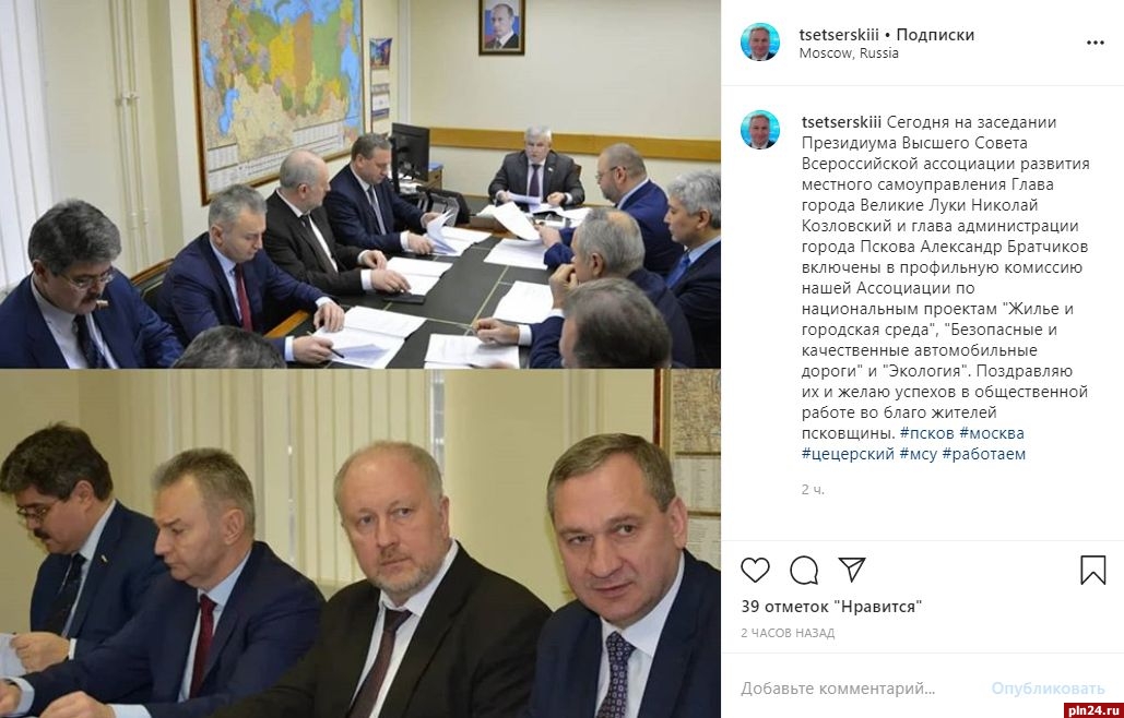 Глава города Великие Луки Николай Козловский и глава администрации Пскова Александр Братчиков включены в профильную комиссию Всероссийской ассоциации развития местного самоуправления по национальным проектам. Об этом сообщил в своем Instagram-аккаунте председатель правления ассоциации, депутат Псковской городской Думы Иван Цецерский.