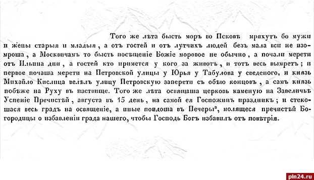 Первые документально зафиксированные карантинные мероприятия в истории России проводились именно на Псковской земле в 1521 году. Об этом интересном факте написал в своем Инстаграм губернатор Псковской области Михаил Ведерников и опубликовал фото Церкви Успения с Парома и текста из псковской летописи.