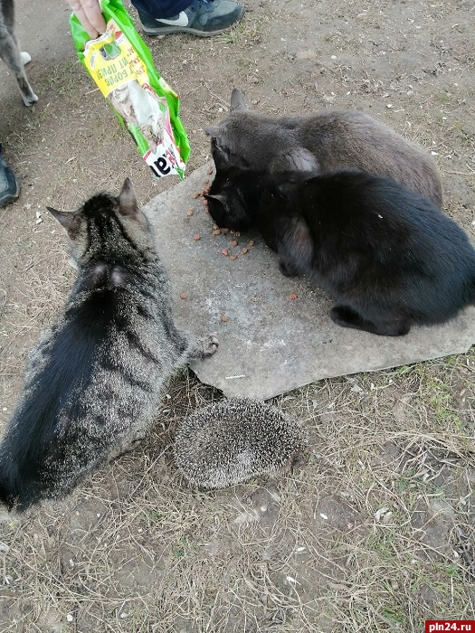 На снимках видно, что еж подобрался близко к трем котам, пока те ели корм, и даже составил им компанию.