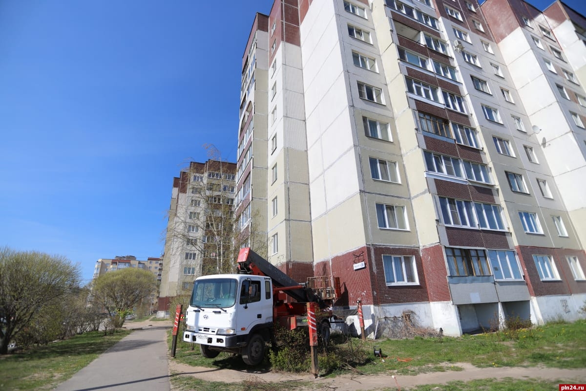 Как сообщает корреспондент Псковской Ленты Новостей, к настоящему времени загрунтовано три этажа, ночью на фасад нанесут лазером разметку.