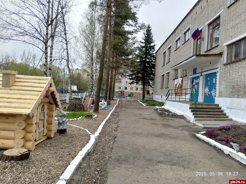 Детский сад «Звездочка» в Невеле готовится к празднованию Дня Великой Победы. На территории сада установили сказочный деревянный домик.