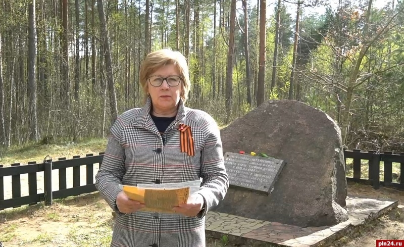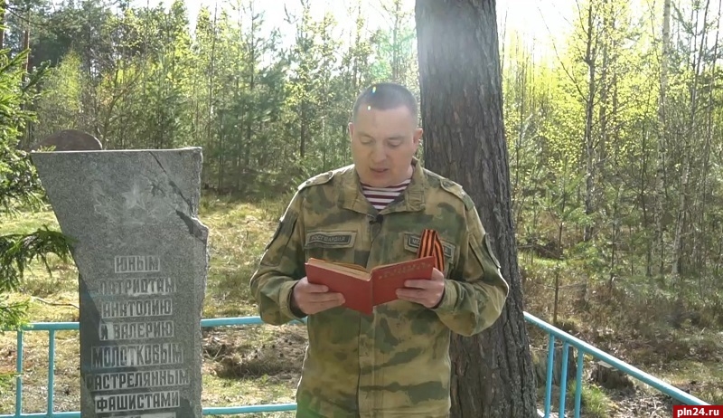 Заведующая библиотекой микрорайона Любятово «БиблиоЛюб» Елена Сойтту прочитала письмо красноармейца Василия Прохорова, а офицер управления Росгвардии по Псковской области майор Павел Морозов прочитал отрывок из книги о подвигах братьев Молотковых.