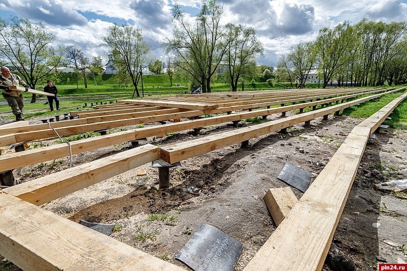 Эта территория располагается на правом берегу реки Псковы, между пешеходным и Советским мостом. Объект переходящий, работы здесь начались в прошлом году и будут завершены уже в сентябре. Ранее подрядчик проложил здесь основные коммунальные сети, установил опоры наружного освещения и сваи, а с конца апреля начал укладывать на них фундамент под интерактивную площадку. Напомним, в половодье эта часть берега реки нередко подтапливается, поэтому площадку было решено установить на сваи разного уровня и тем самым приподнять. Она развернется на площади 1,5 тыс кв. м и будет использоваться для проведения массовых мероприятий. Для фундамента используется специально обработанная влагостойкая древесина. Изначально по проекту на основании площадки планировалось установить навес полусферической формы. Стационарный объект установить не представляется возможным — областной комитет по охране объектов культурного наследия не дал согласование. Поэтому речь может идти только о сборно-разборной конструкции. Роман Кухи сегодня высказал мнение, что не видит «полусферу» в том месте, где она запланирована по проекту — прямо в центре парка Строителей, и предложил перенести этот объект несколько дальше, в сторону Советского моста. Вопрос по месту установки «полусферы» решено обсудить в ближайшее время на отдельном совещании.