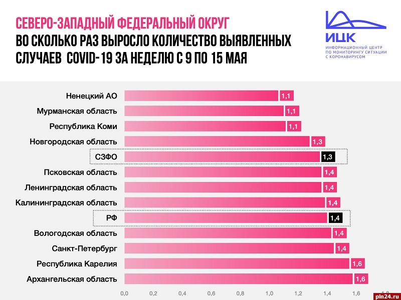 По темпам прироста выявленных заболевших показатели СЗФО ниже среднего по стране: 1,3 раза по СЗФО против 1,4. Это также ниже показателей прошлой недели, когда был зафиксирован прирост в 1,5 раза против 1,6 по России в целом.
