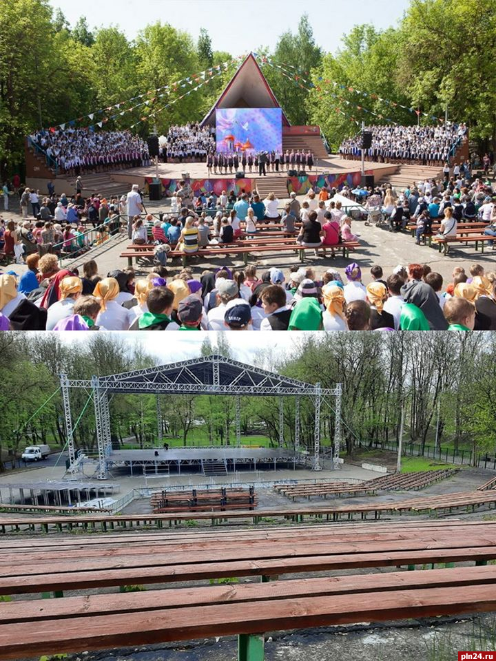 А я продолжаю. 19 мая известный псковский журналист Сергей Васильев опубликовал в Фейсбуке пост с двумя фотографиями: Зеленый театр несколько лет назад, и Зеленый театр с недавно смонтированной сценой. Цитирую (орфография сохранена): «Было / стало... ((( Жуткое варварство, конечно. Еще одно последствие 90-х - массовое появление и допущение до принятия таких решений людей с отсутствием вкуса и искаженным представлением о целесообразности и эстетике... (((».