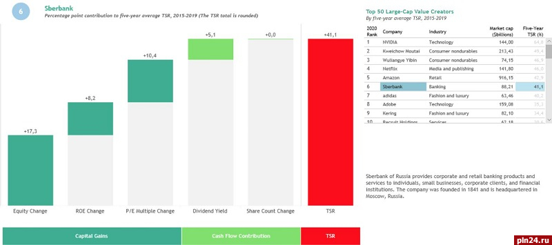 Сбербанк стал лучшим банком мира по созданию акционерной стоимости за последние пять лет согласно рейтингу, подготовленному компанией BCG. По этому показателю банк также занял 6-е место среди крупнейших по рыночной капитализации компаний мира, всего в рейтинг вошли 50 компаний, сообщили Псковской Ленте Новостей в пресс-службе банка.