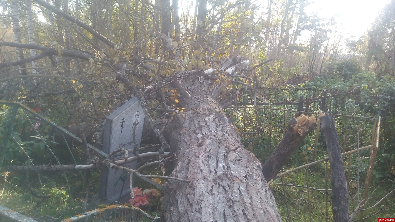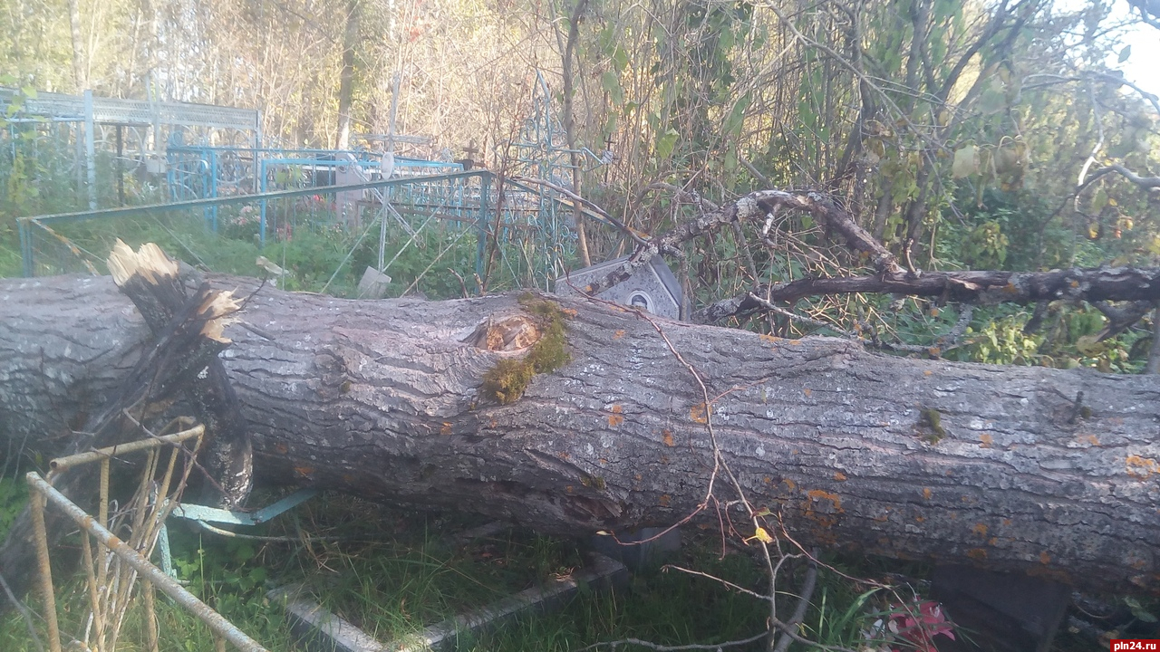 Большое дерево, упавшее на кладбище «Кунево» в Пушкиногорском районе в сентябре 2019 года, все еще не убрано. Об этом сообщается в сообществе «Краеведы Пушкиногорья» в социальных сетях.