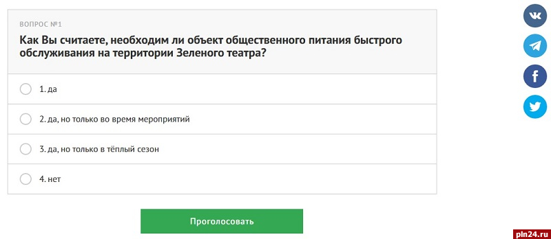 «Как вы считаете, необходим ли объект общественного питания быстрого обслуживания на территории Зеленого театра?» - спрашивают инициаторы опроса у пользователей сайта. На выбор предлагают четыре варианта ответа: «Да»; «Да, но только во время мероприятий»; «Да, но только в теплый сезон»; «Нет».